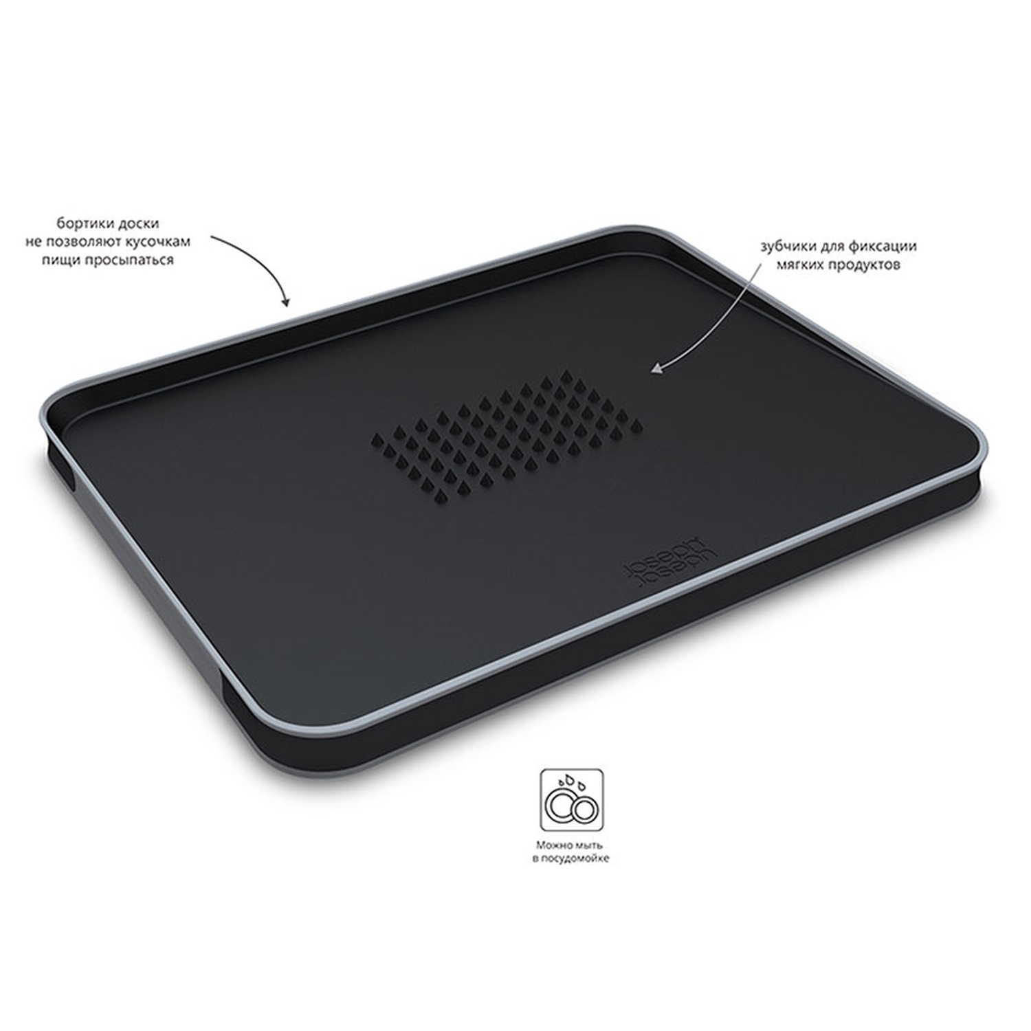 Двусторонняя мультифункциональная разделочная доска. Одна из сторон доски оснащена специальными зубцами для плотной фиксации мяса. Благодаря небольшому наклону и бортикам по краям, вся лишняя жидкость и кусочки продуктов аккуратно собираются и не пачкают поверхность стола. С обратной стороны доска предоставляет гладкую поверхность для нарезания любых продуктов. Обе стороны располагают нескользящими краями и удобными для придерживания стенками. Можно мыть в посудомоечной машине.