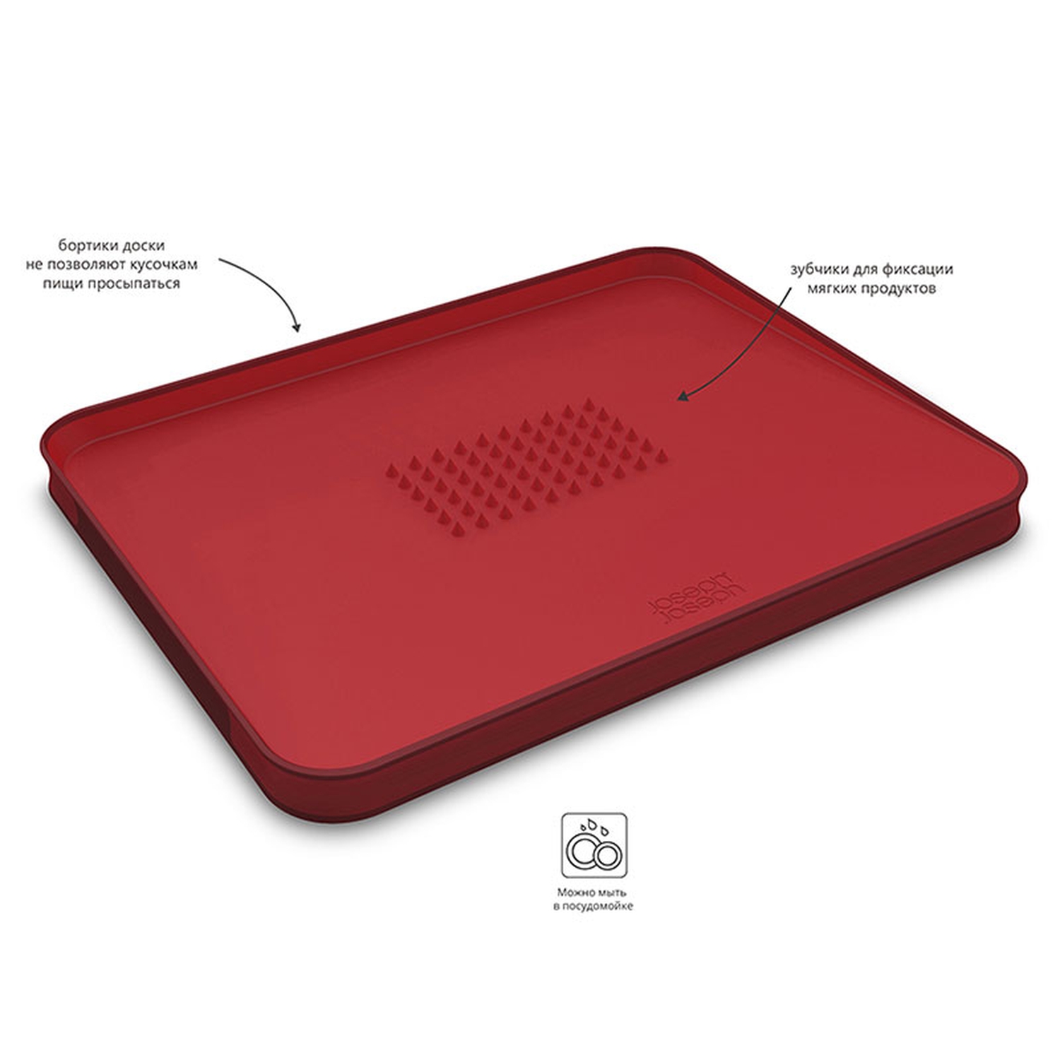 Двусторонняя мультифункциональная разделочная доска. Одна из сторон доски оснащена специальными зубцами для плотной фиксации мяса. Благодаря небольшому наклону и бортикам по краям, вся лишняя жидкость и кусочки продуктов аккуратно собираются и не пачкают поверхность стола. С обратной стороны доска предоставляет гладкую поверхность для нарезания любых продуктов. Обе стороны располагают нескользящими краями и удобными для придерживания стенками. Можно мыть в посудомоечной машине.