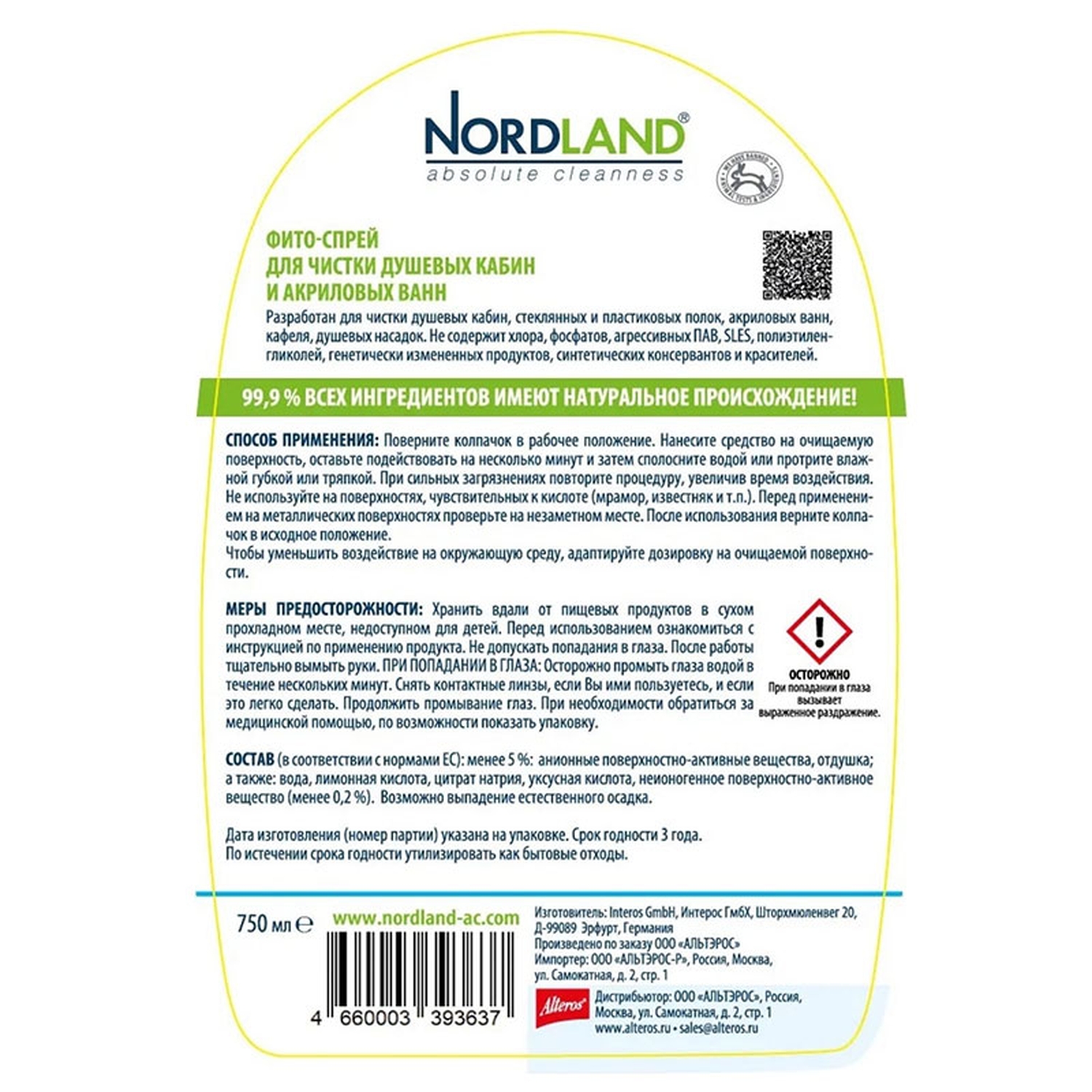 Фито-спрей NORDLAND для чистки душевых кабин и акриловых ванн, 750 мл. Разработан для чистки душевых кабин, стеклянных и пластиковых полок, акриловых ванн, кафеля, душевых насадок. Не содержит хлора, фосфатов, агрессивных ПАВ, SLES, полиэтиленгликолей, генетически измененных продуктов, синтетических консервантов и красителей.