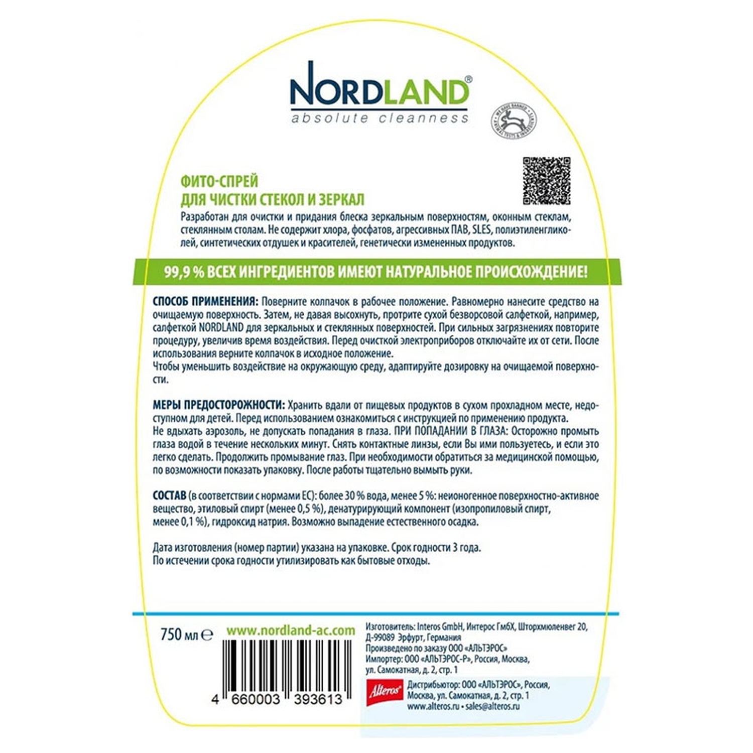 Фито-спрей NORDLAND для чистки стекол и зеркал, 750 мл. Разработан для очистки и придания блеска зеркальным поверхностям, оконным стеклам, стеклянным столам. Не содержит хлора, фосфатов, агрессивных ПАВ, SLES, полиэтиленгликолей, генетически измененных продуктов, синтетических консервантов и красителей.