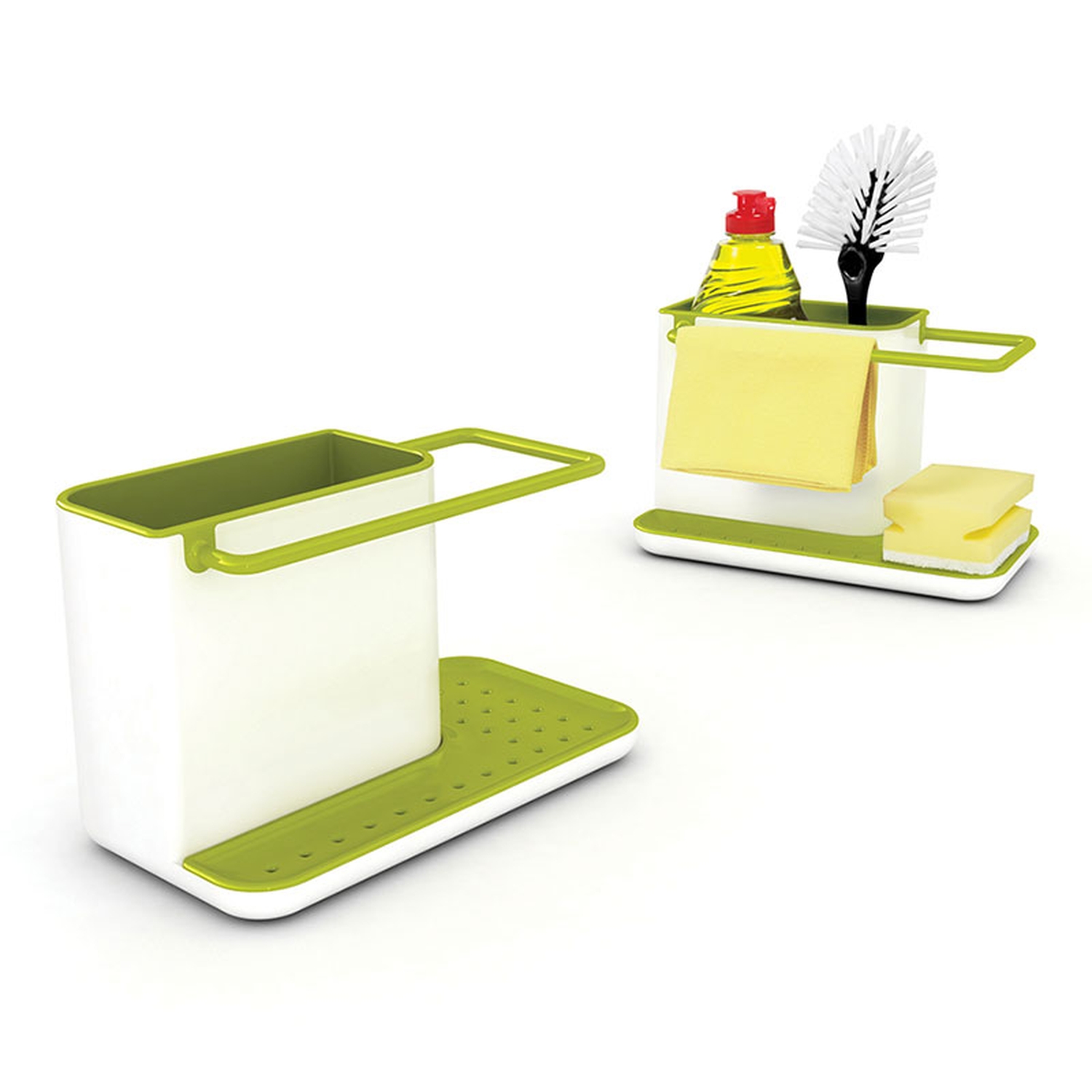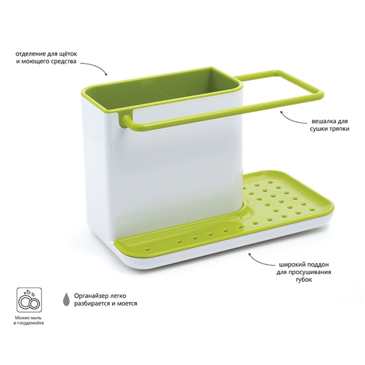 Безусловный хит категории продуктов для уборки и хранения. Вместительная основная ёмкость органайзера предназначена для хранения щеток и бутылок со средствами для мытья. На вешалке, расположенной вдоль ее внешнего края, удобно сушить небольшие тряпки. Широкий поддон с отверстиями предоставляет место для просушивания губок, а скрывающийся под ним резервуар аккуратно собирает стекающую воду. Органайзер легко собирается и разбирается для чистки. Можно мыть в посудомоечной машине.