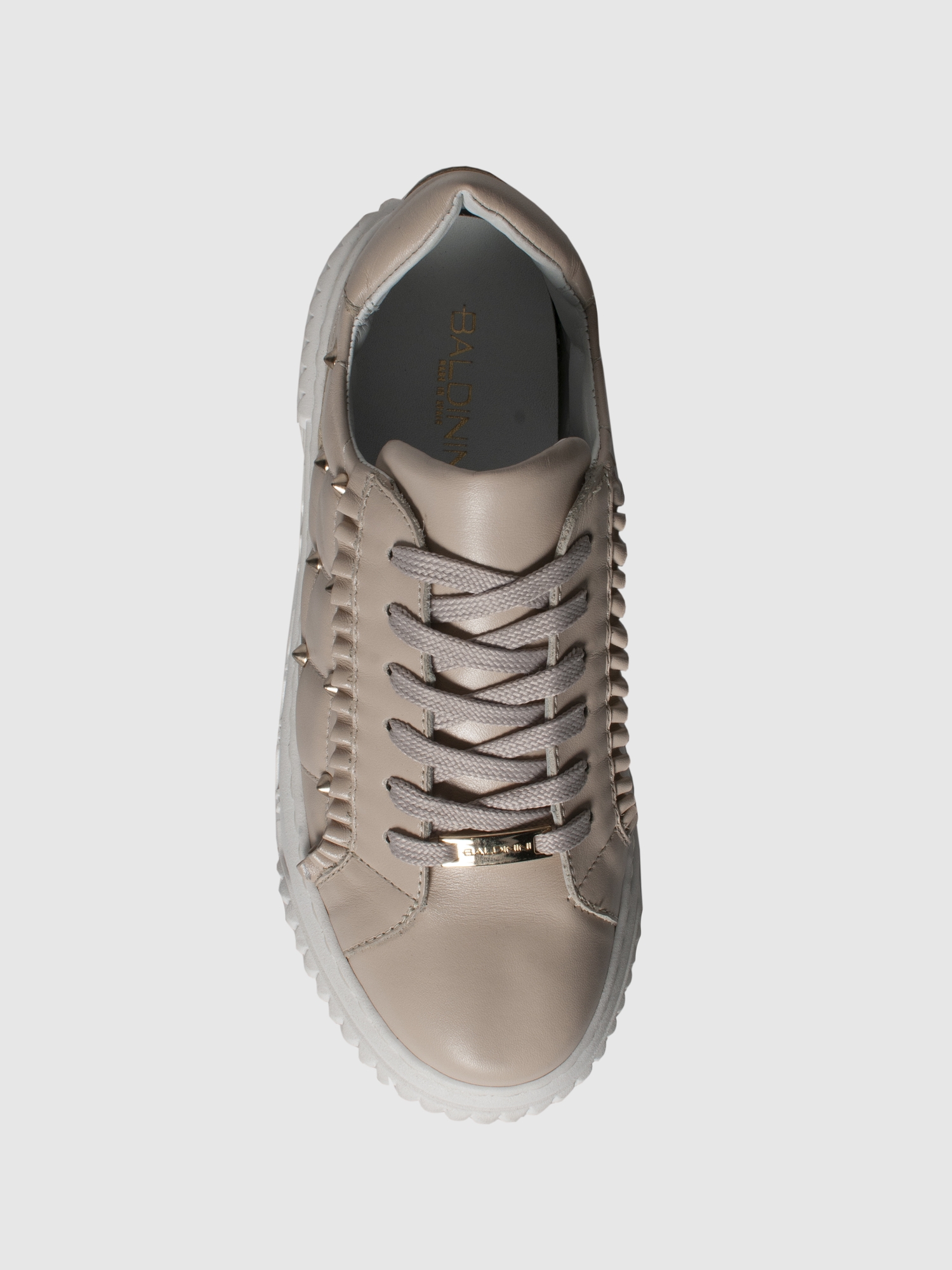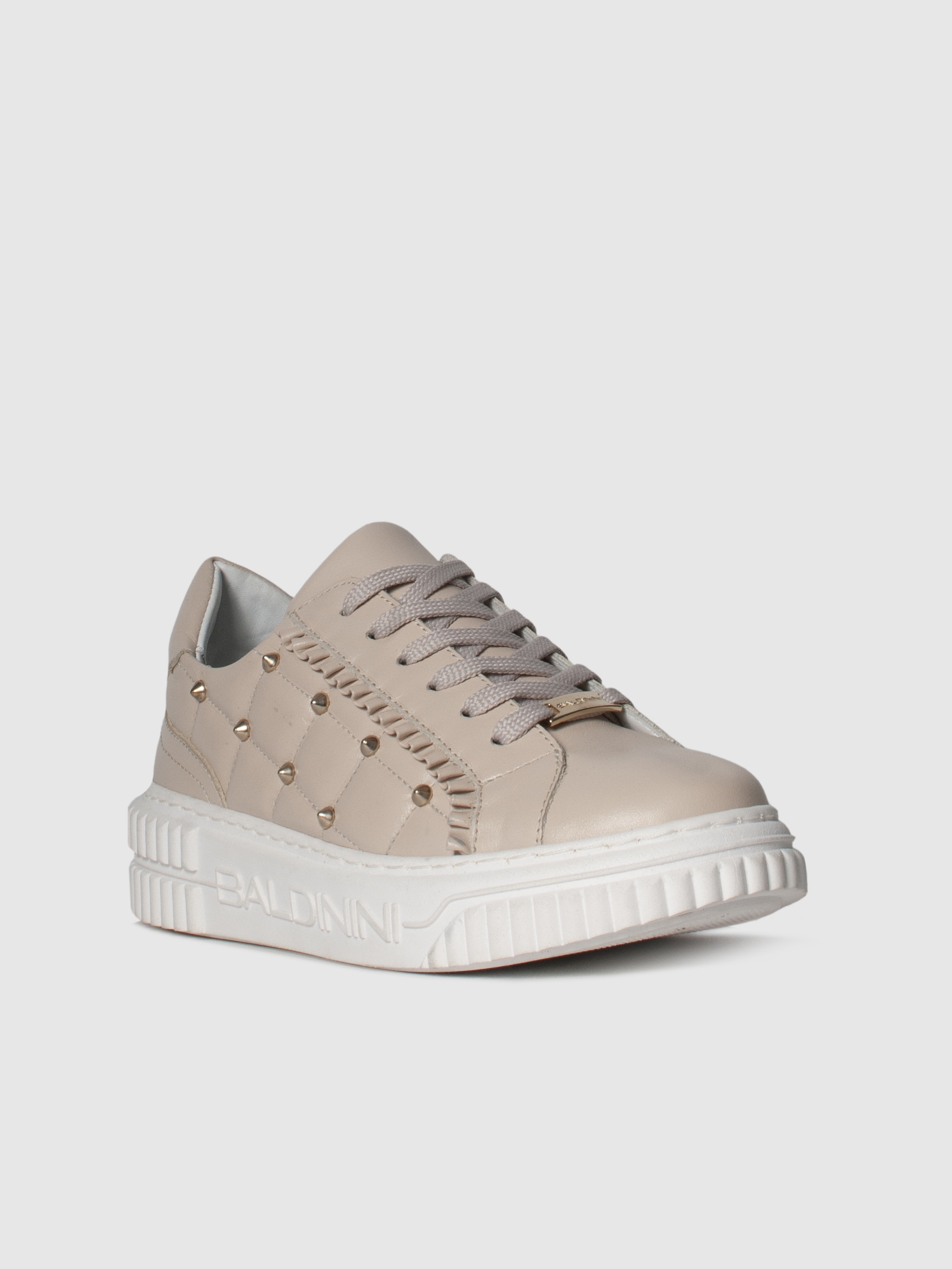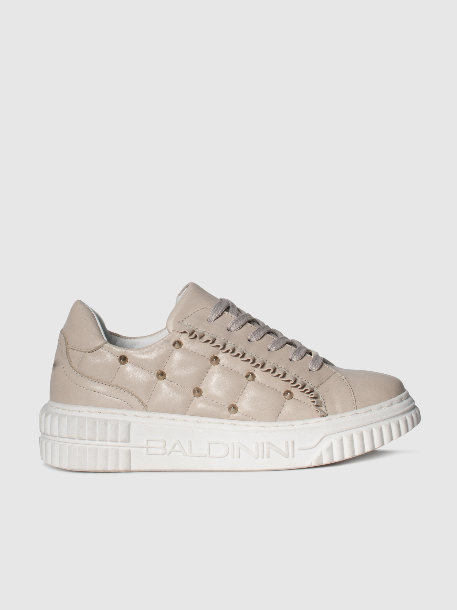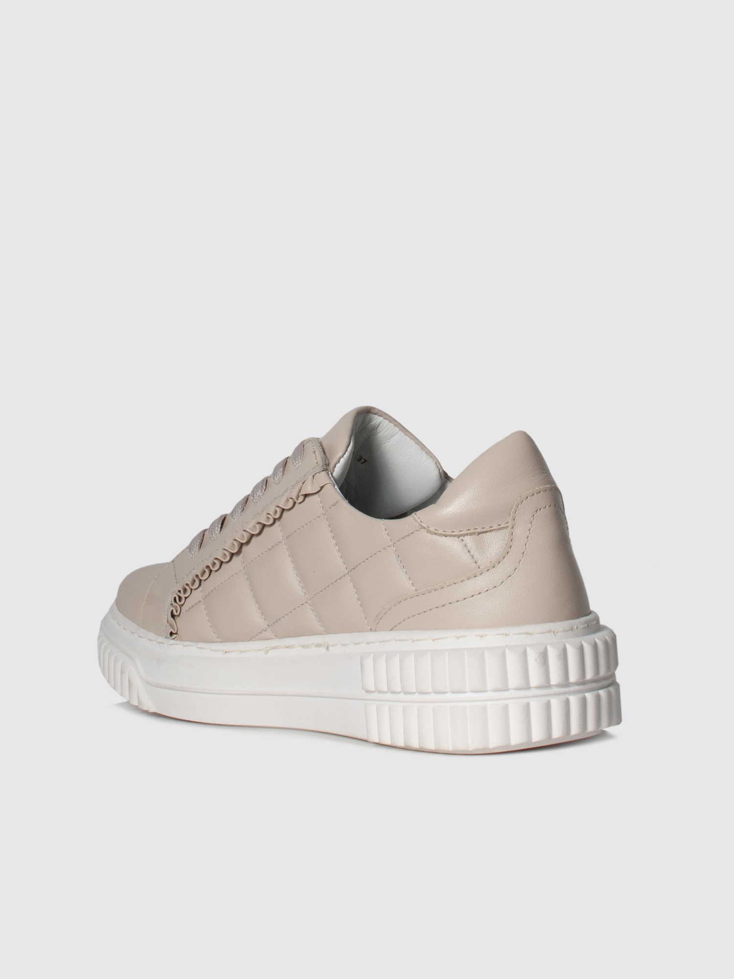 Бежевые кроссвоки на текстильной шнуровке станут базовой парой на осень. Модель выполнена из гладкой натуральной кожи со стеганым эффектом, на резиновой подошве. Внутри подклад и стелька также из кожи. Дизайн завершает тиснённая надпись в виде логотипа на подошве. Пара может дополнить практически любой образ.