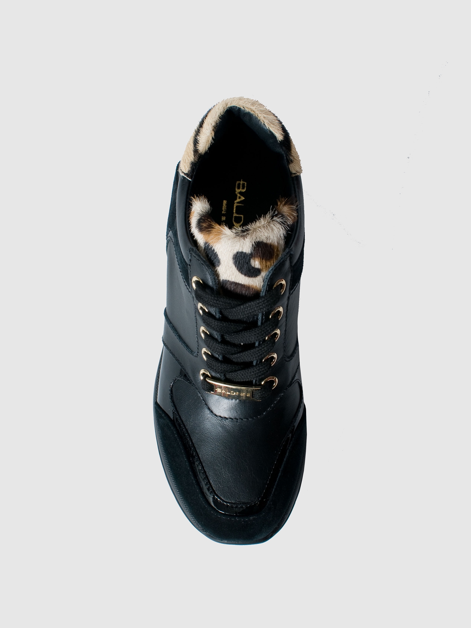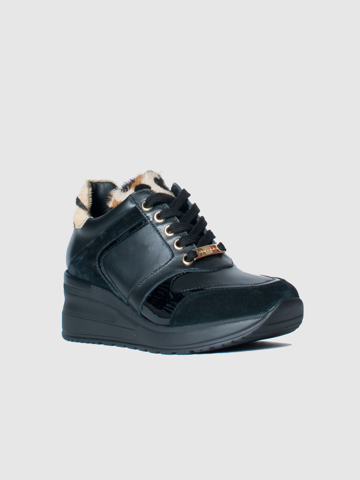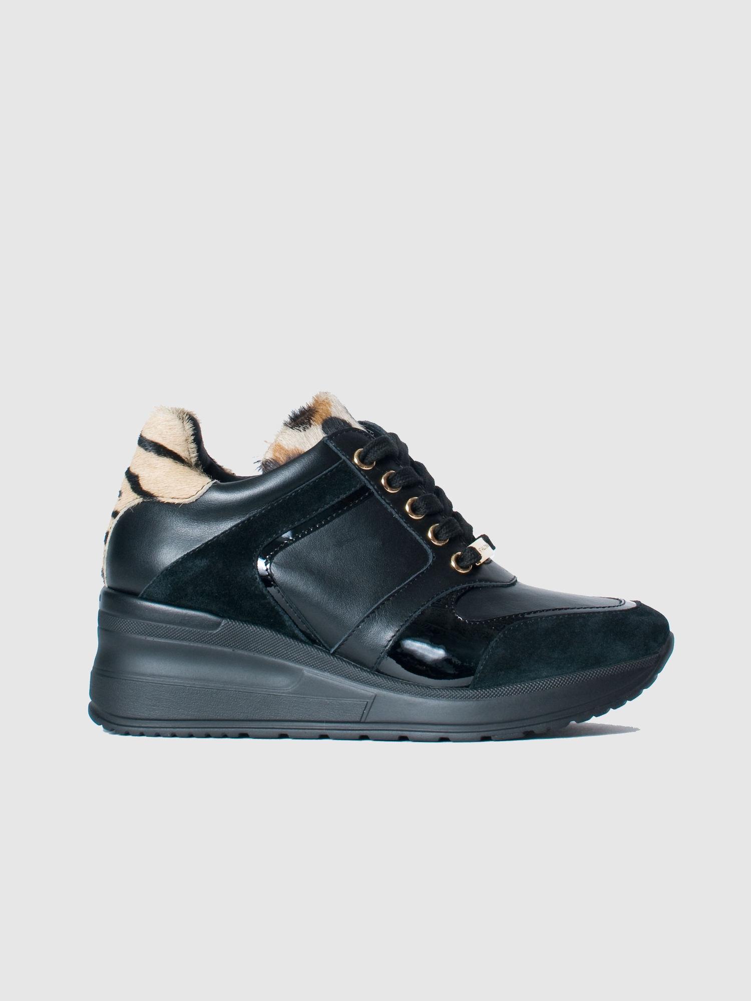 Черные кроссовки помогут разнообразить осенние образы. Модель выполнена из натуральной кожи с вставками из замши, лакированной кожи и декоративным мехом с анималистичным принтом. Внутри подклад и стелька из кожи. Резиновая танкетка делает эту пару идеальной для составления женственных образов с платьями и юбками.