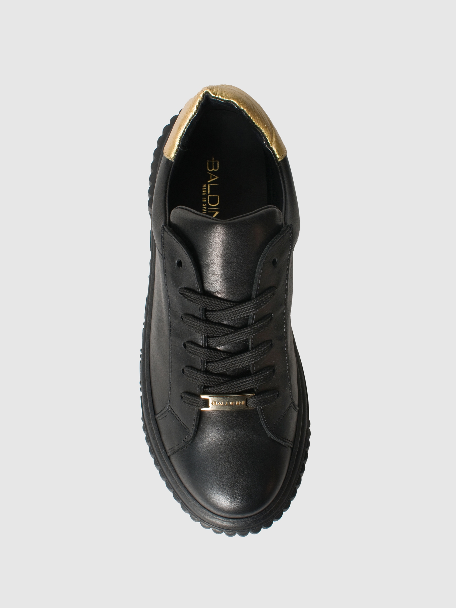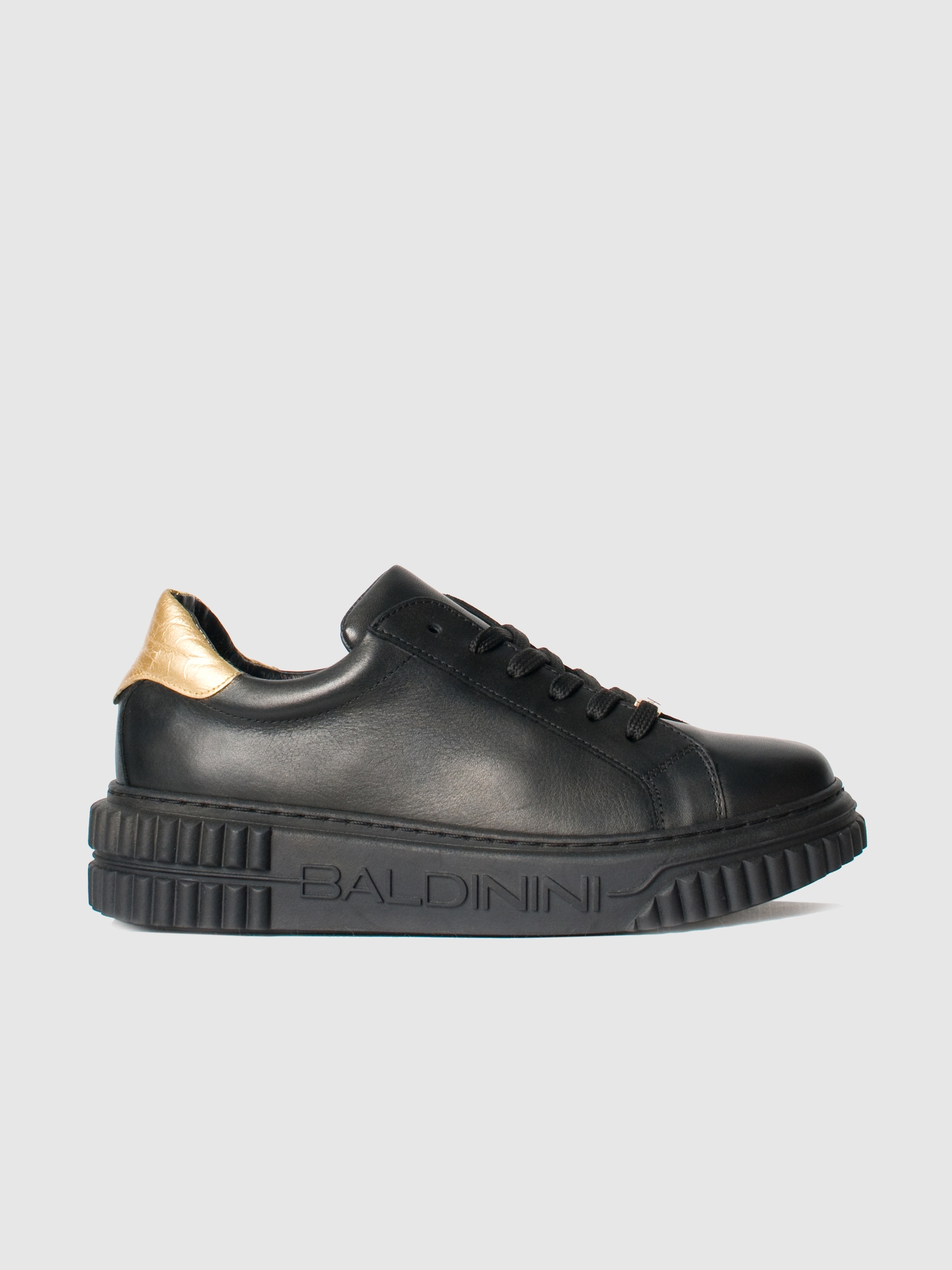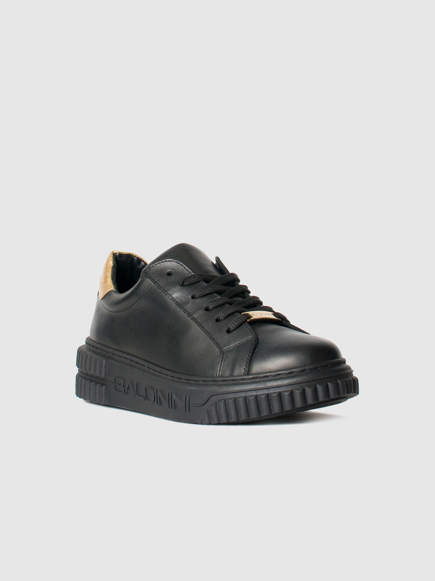 Кроссовки из чёрной телячьей кожи от Baldinini. Эти минималистичная, но стильная пара хорошо сочетается с любым ансамблем. Модель имеет чёрную резиновую подошву с логотипом Baldinini, текстильную шнуровку в цвет, а вставка из блестящей кожи служит завершающим штрихом. Внутри подклад и стелька из натуральной кожи.