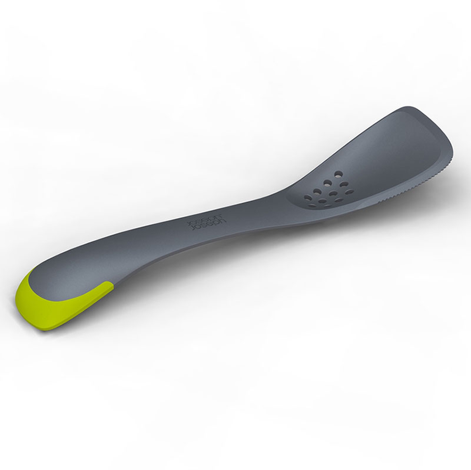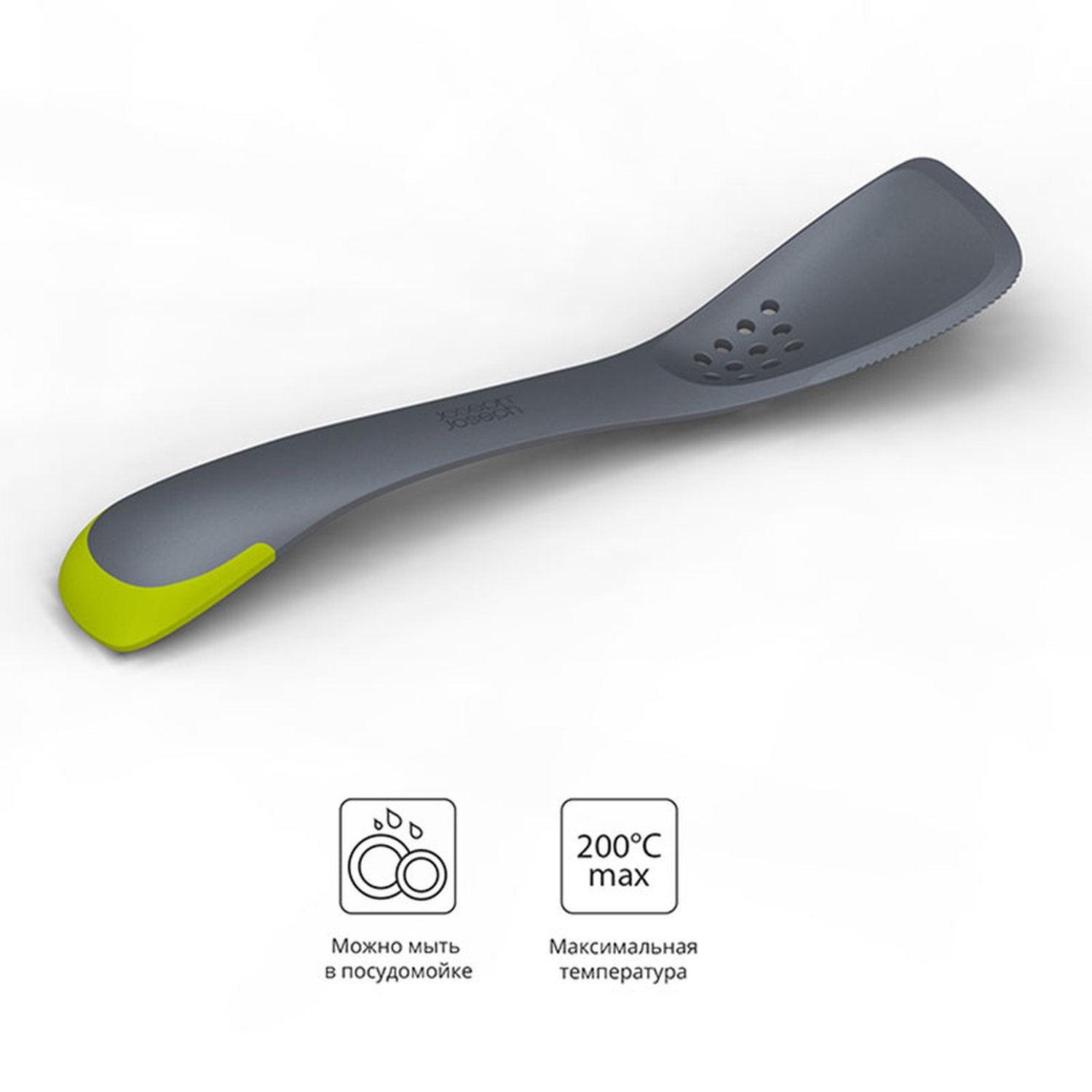 Удачное решение для тех, кто устал то и дело подолгу разыскивать тот или иной инструмент в кухонном ящике. Uni-tool объединяет сразу пять приборов в одном, позволяя эффективно сэкономить место на кухне. В зависимости от необходимости, выполняет функции обычной ложки, ложки-шумовки, ложки для переворачивания, лопатки для замешивания. А режущий край поможет поделить ингредиенты на части. Инструмент изготовлен из прочного нейлона и силикона, подходит для совместного использования с противопригарной посудой и выдерживает температуру до 200 °C. Можно мыть в посудомоечной машине.
