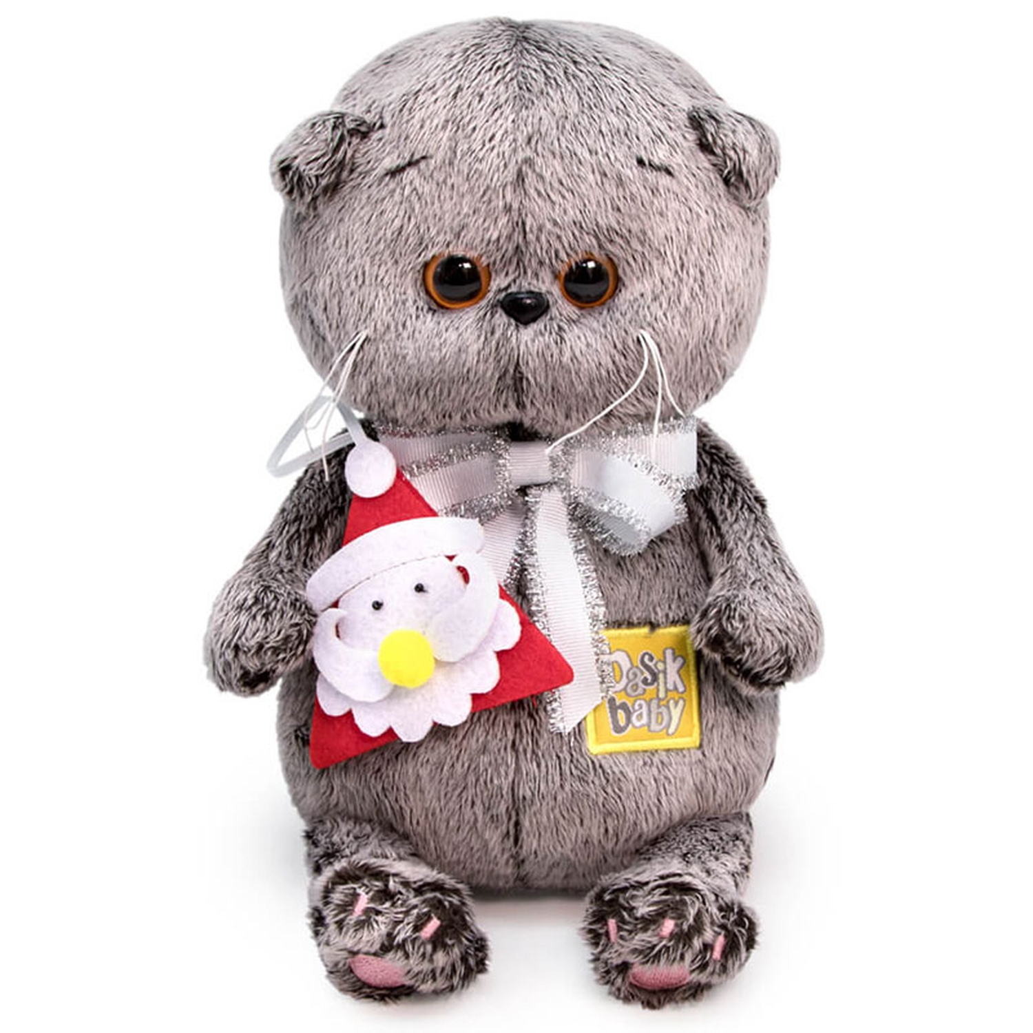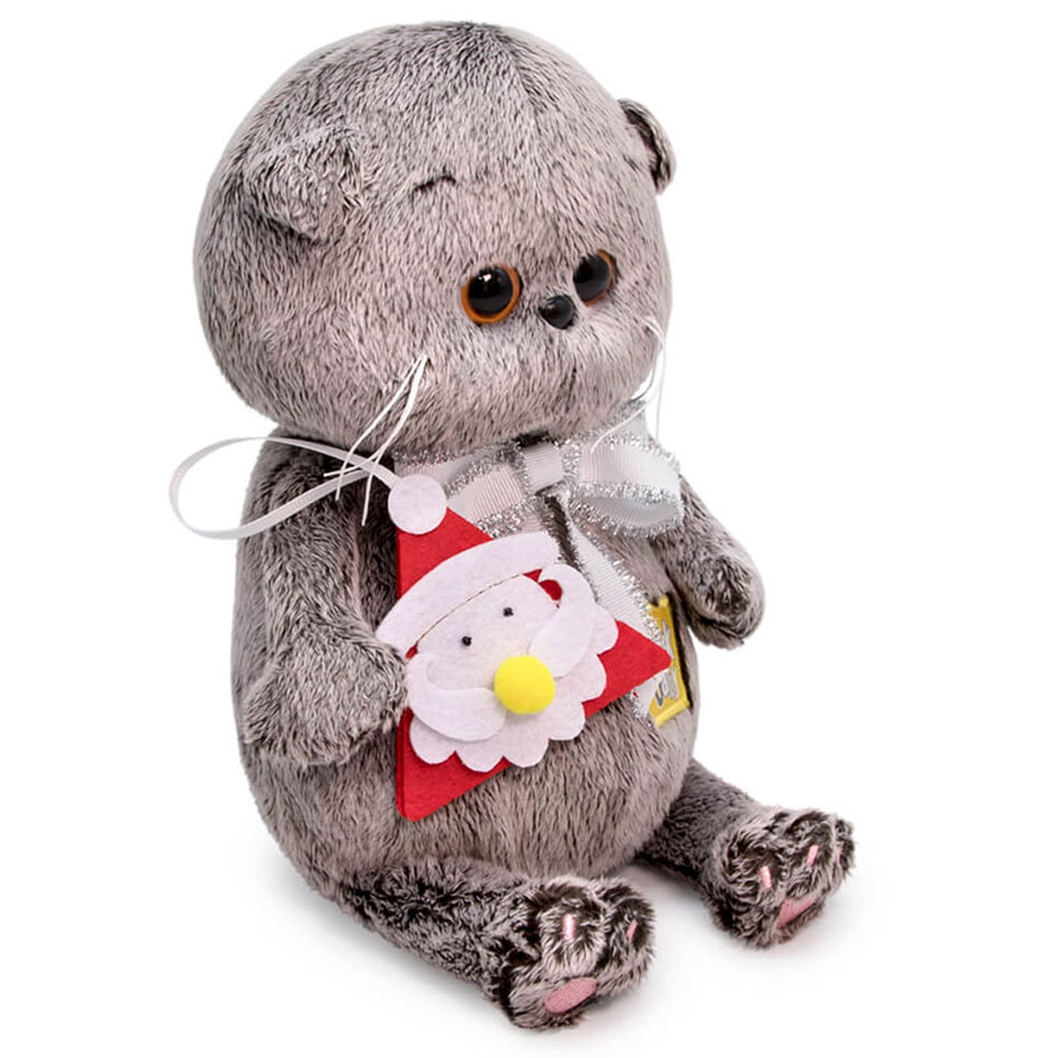 Котенок Басик держит в лапках елочную игрушку — забавного Деда Мороза, выполненного вручную из красного и белого фетра, черного бисера и лимонного помпона. Игрушку с удовольствием можно повесить на елочку. Также на Басике очень красивый бант из белой сутажной ленты с серебряной бахромой.