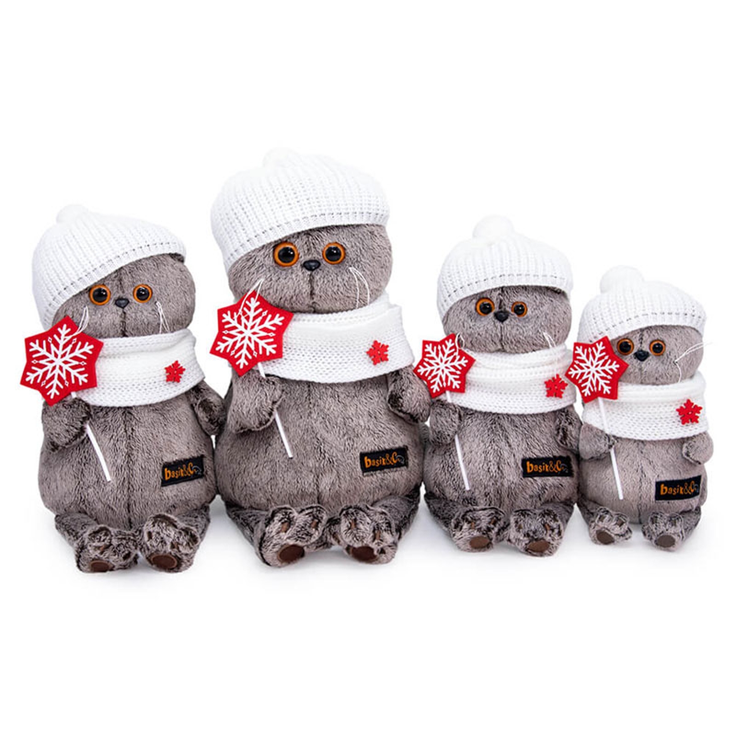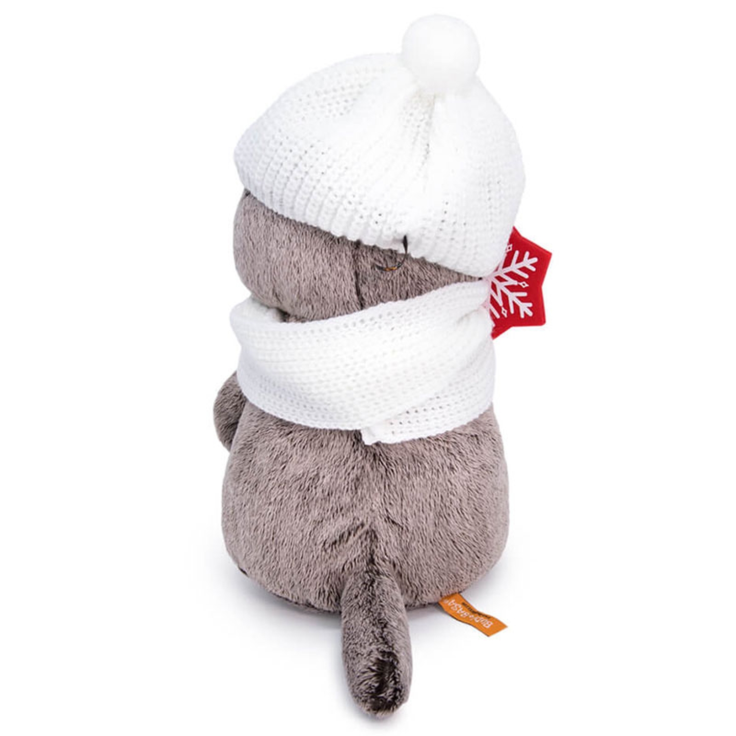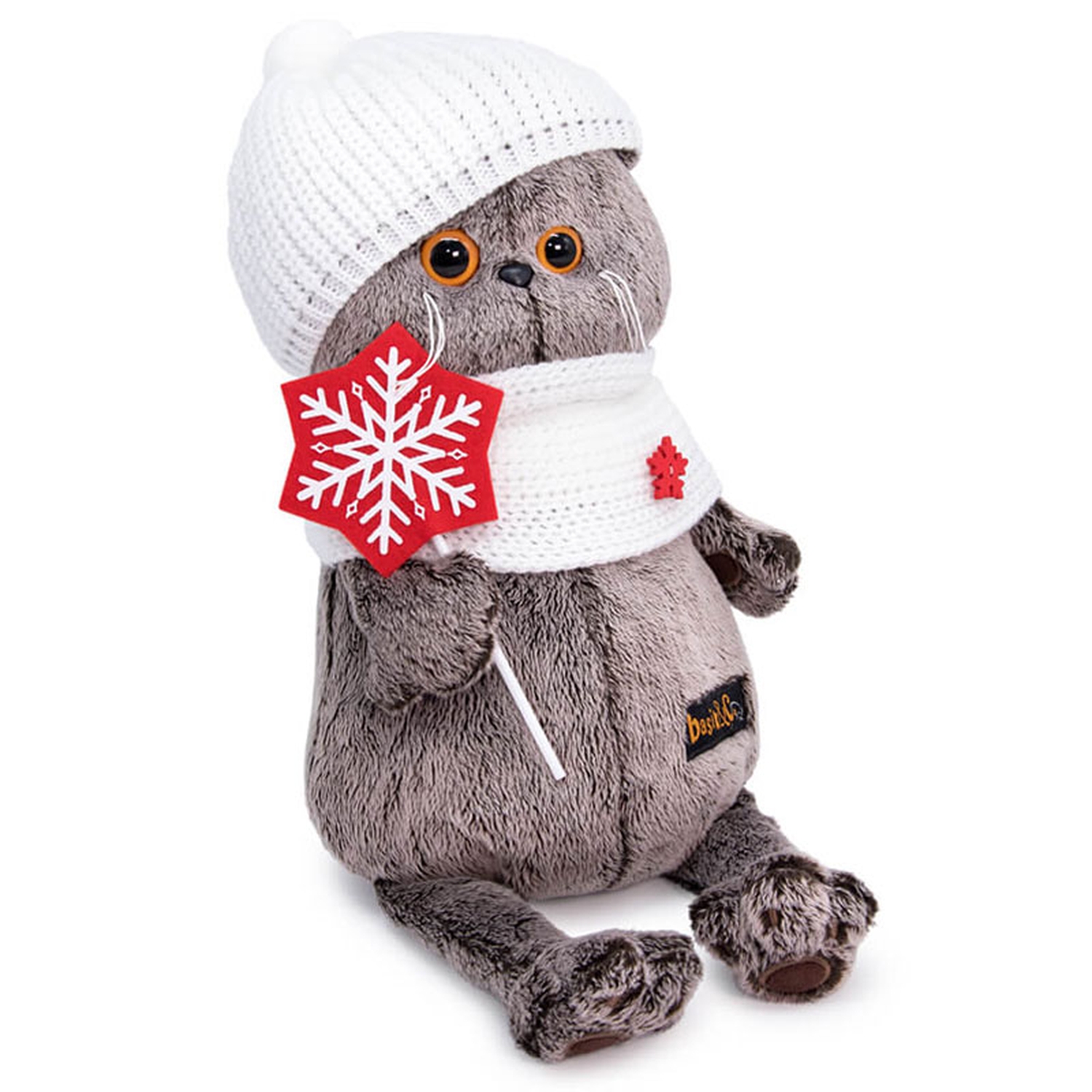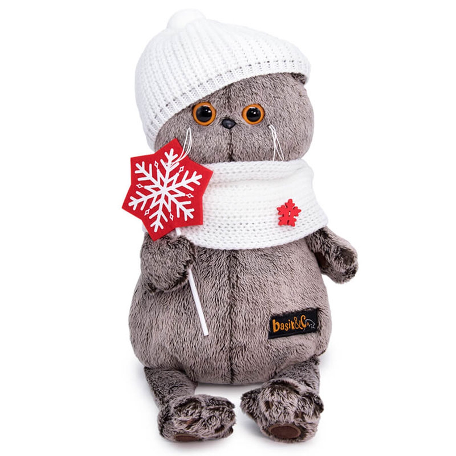 Кот Басик в милом вязаном комплекте — белоснежном снуде и шапочке с помпоном. Снуд украшен деревянной красной снежинкой. В лапках Басик держит красную звездочку из фетра с белой снежинкой на палочке.