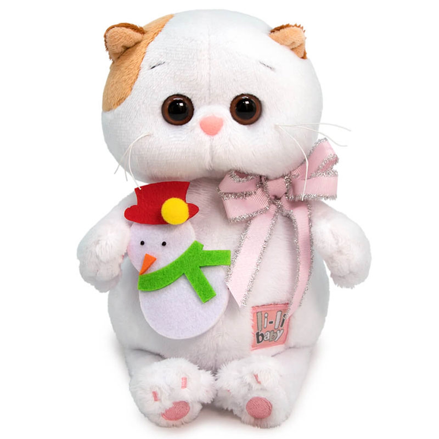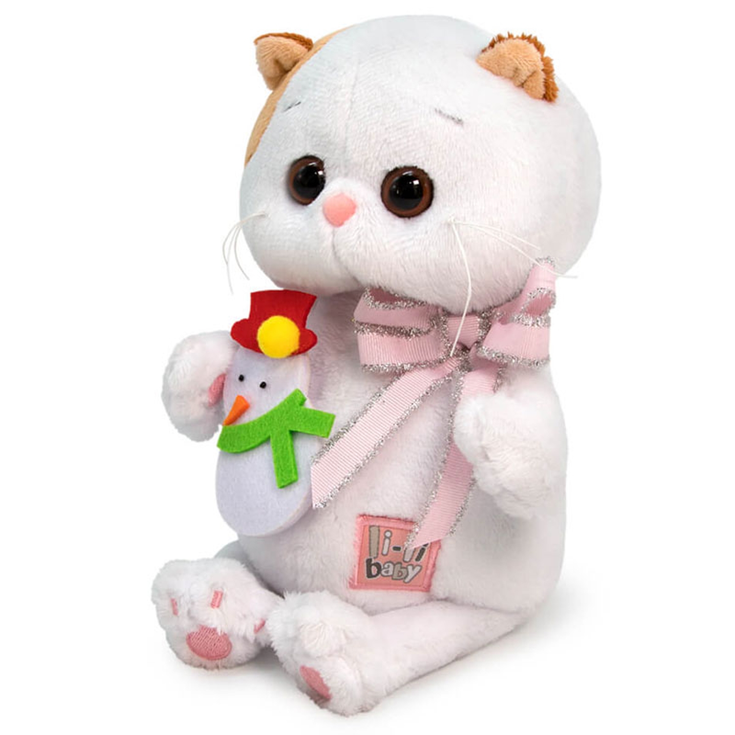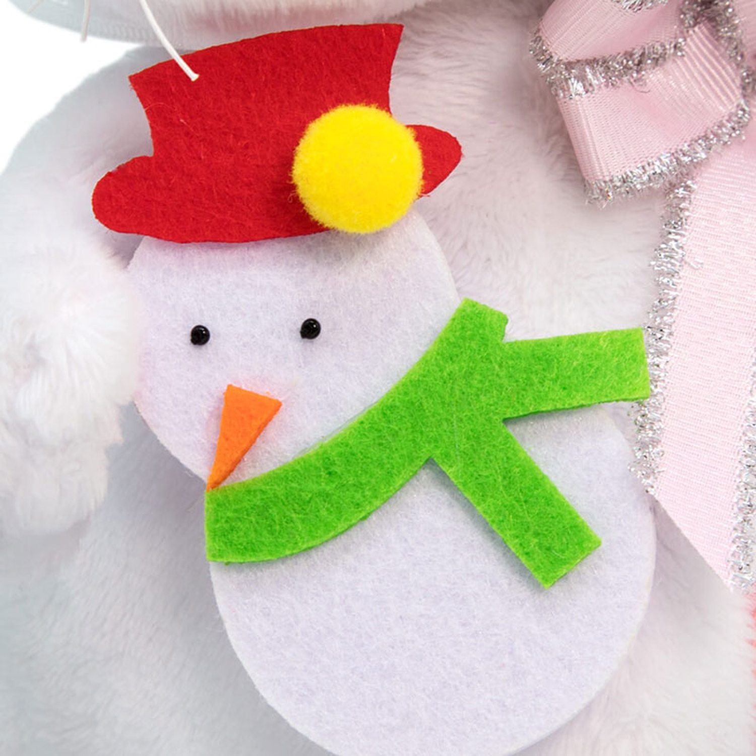 Лиличка держит в лапках елочную игрушку — забавного Снеговика, выполненного вручную из фетра, черного бисера и лимонного помпона. Игрушку с удовольствием можно повесить на елочку. Также на Лиличке очень красивый бант из нежно розовой сутажной ленты с серебряной бахромой.