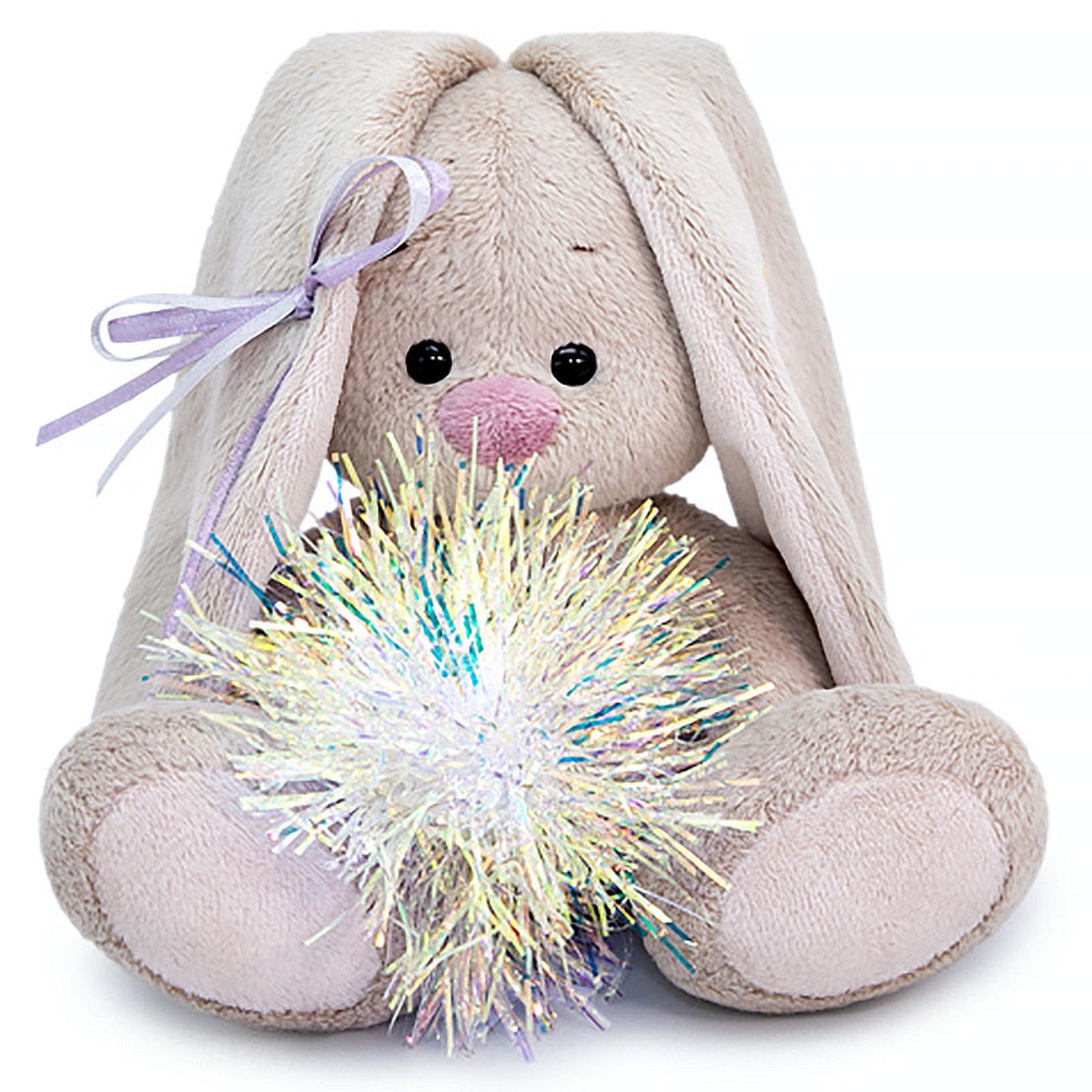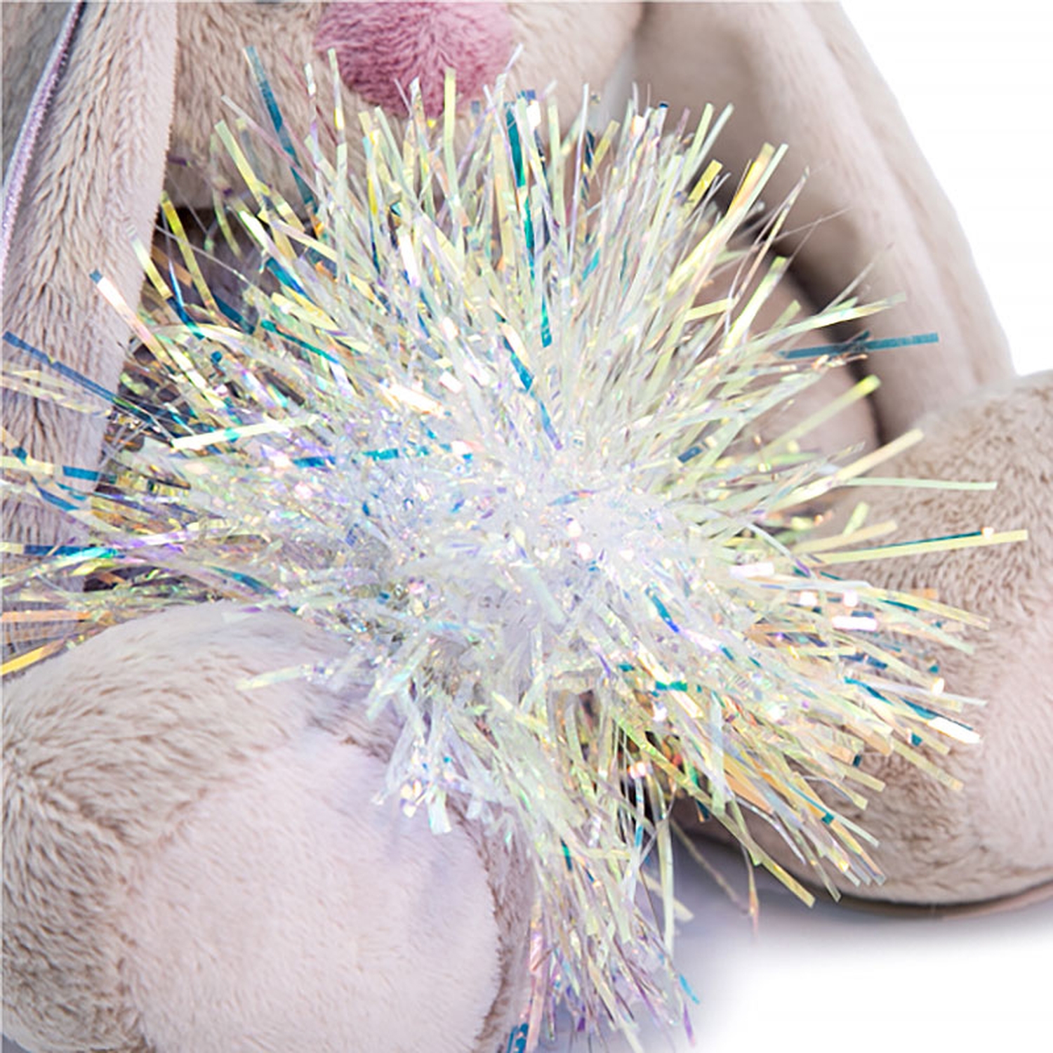 Зайка держит в лапках ёлочное украшение словно бенгальский огонёк объёмный помпон из металлизированных нитей. На ушке у Зайки бантик из двух атласных лент.