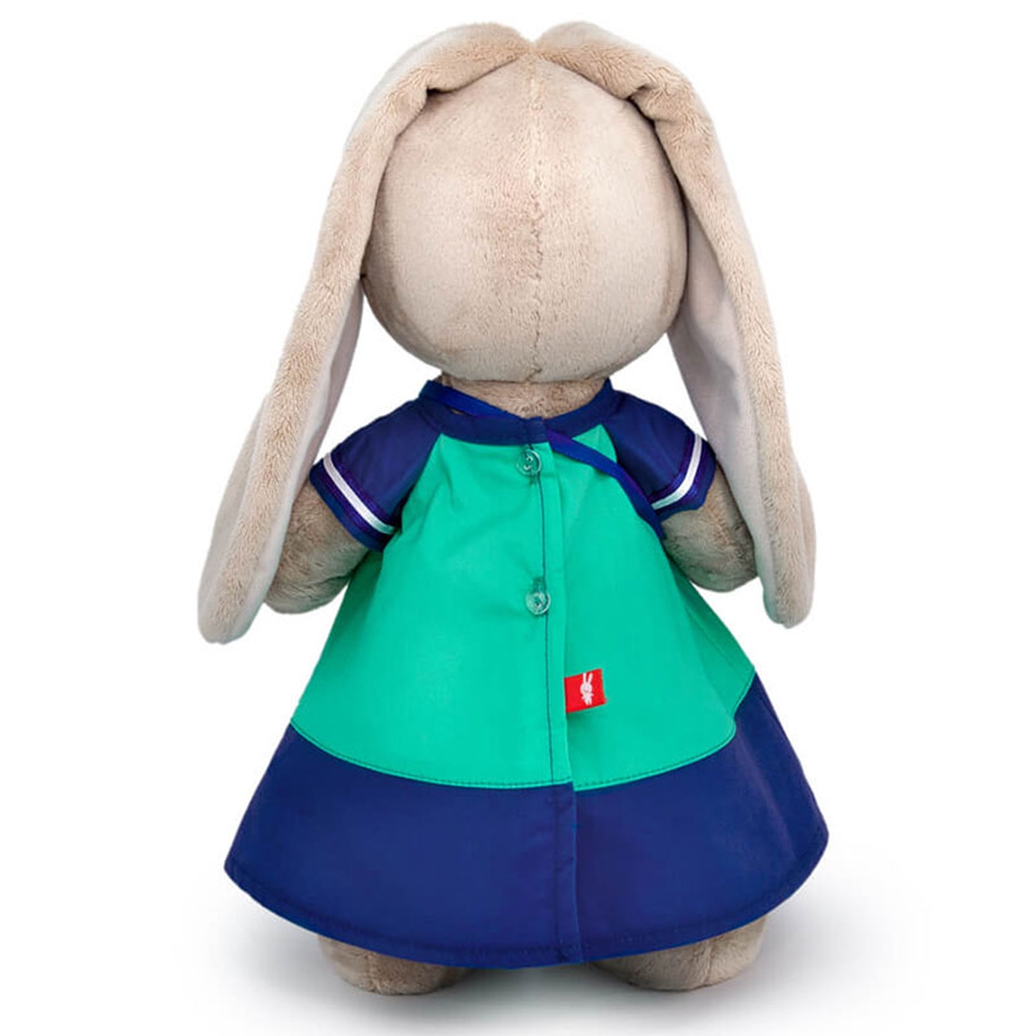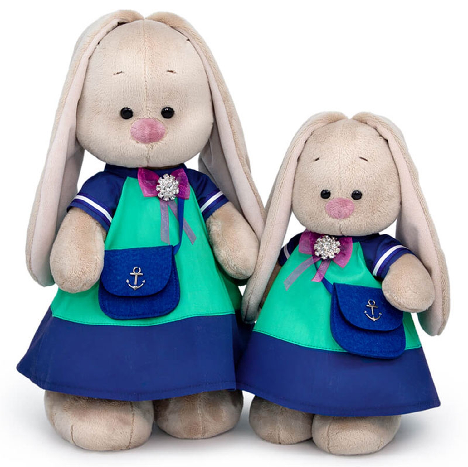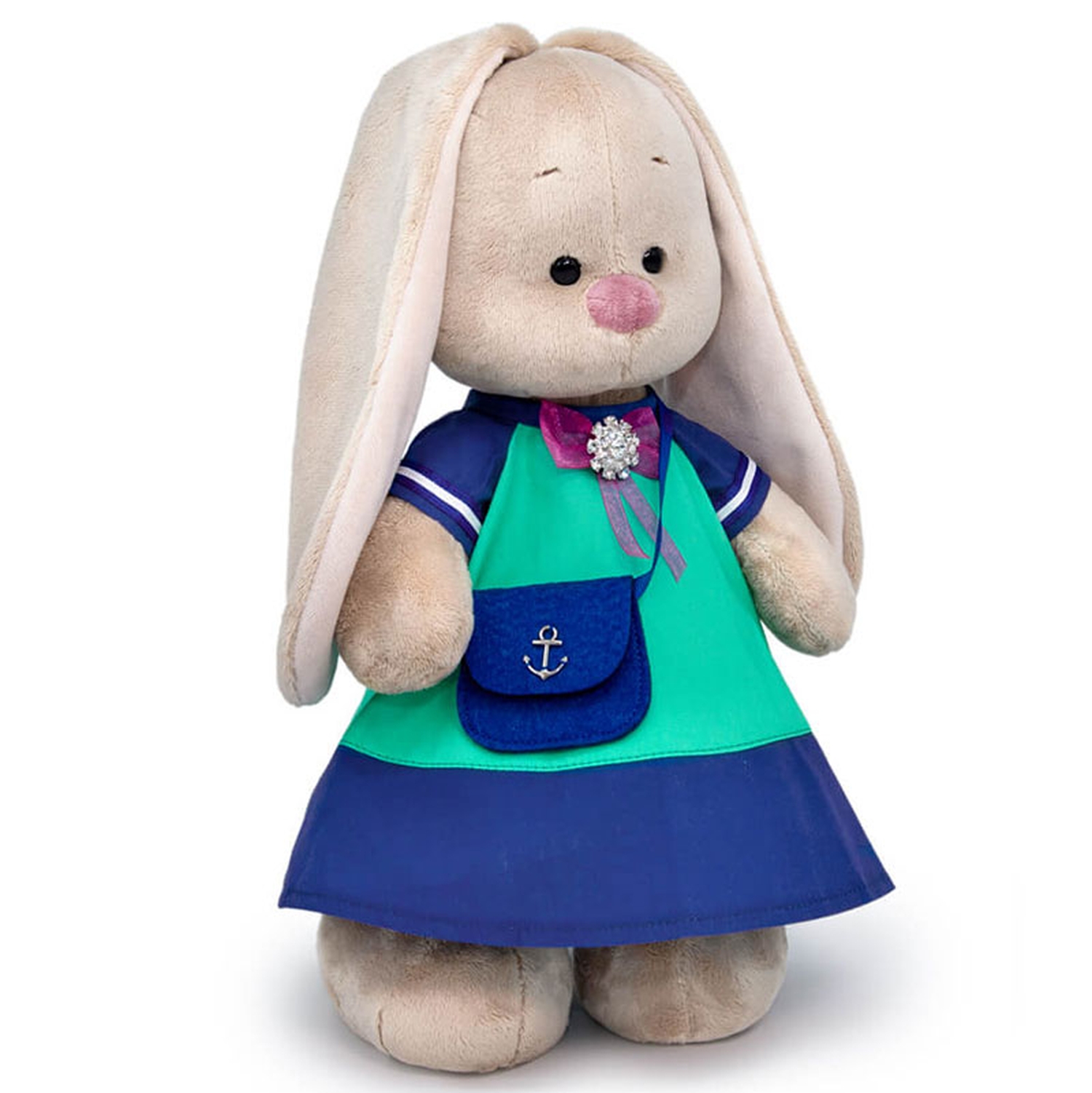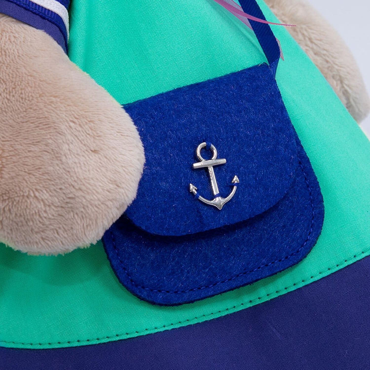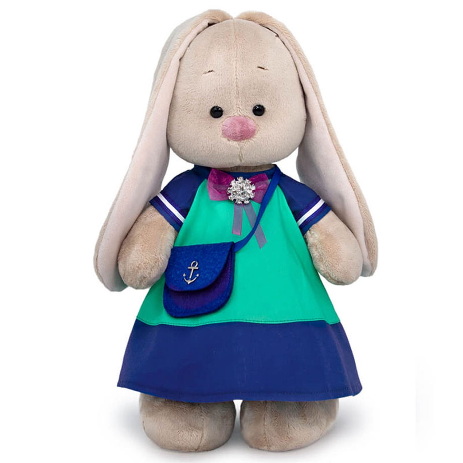 Зайка Ми в классном платье, сшитом из плотной ткани двух цветов, синей и бирюзовой. По низу рукава пришита бело синяя тесьма. Платье украшает сиреневый бант с шикарной брошью, усыпанной стразами. В комплекте фетровая сумочка цвета глубокой воды с металлическим якорем.