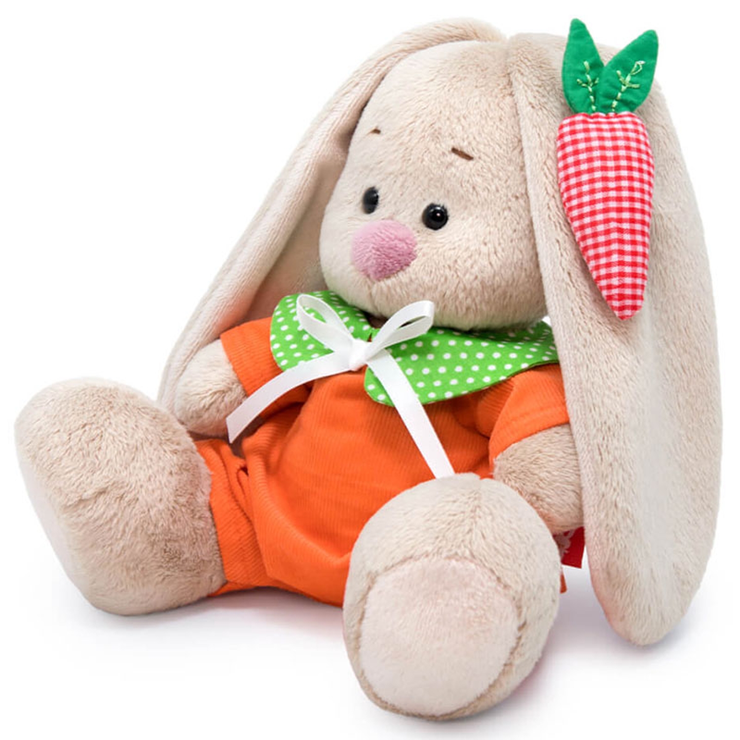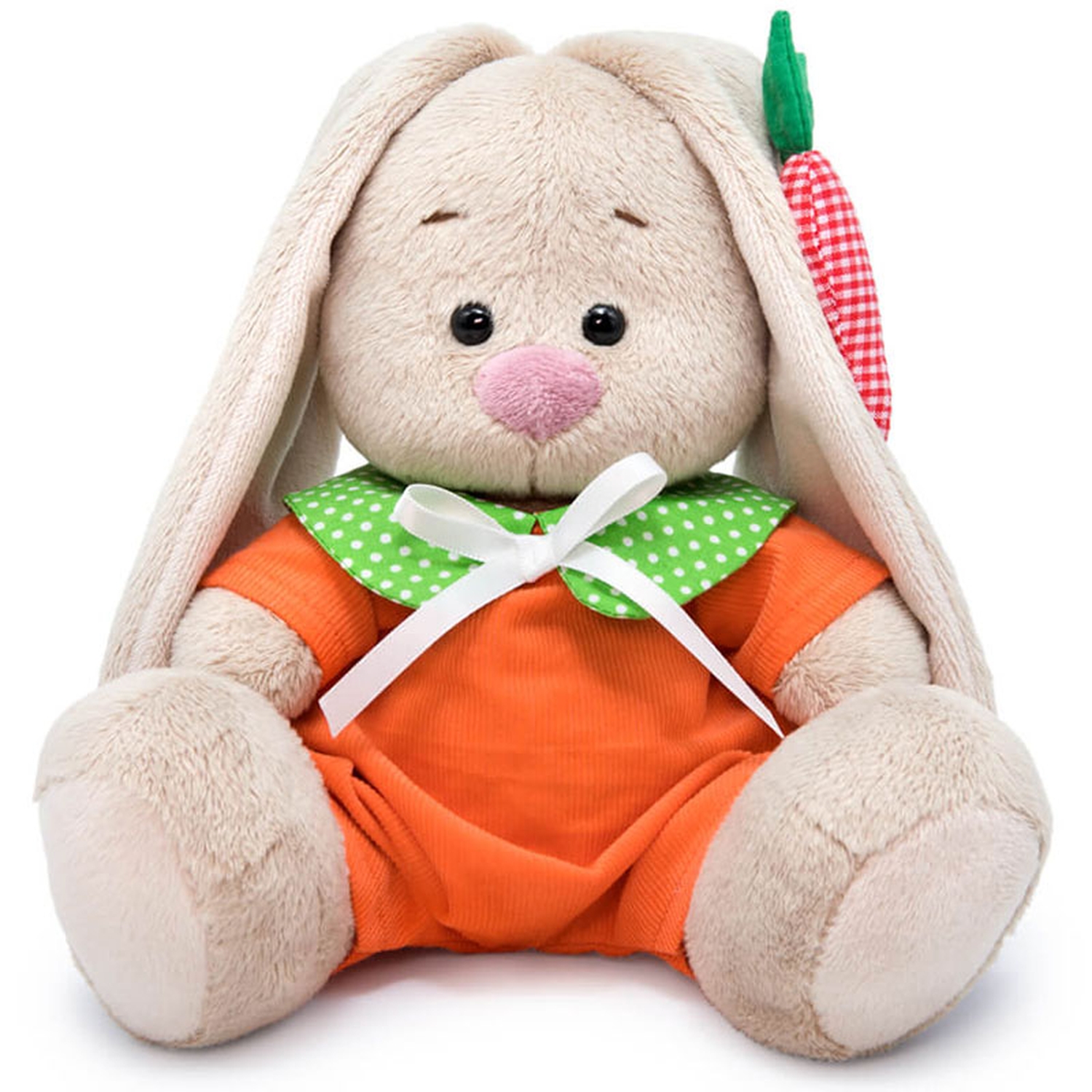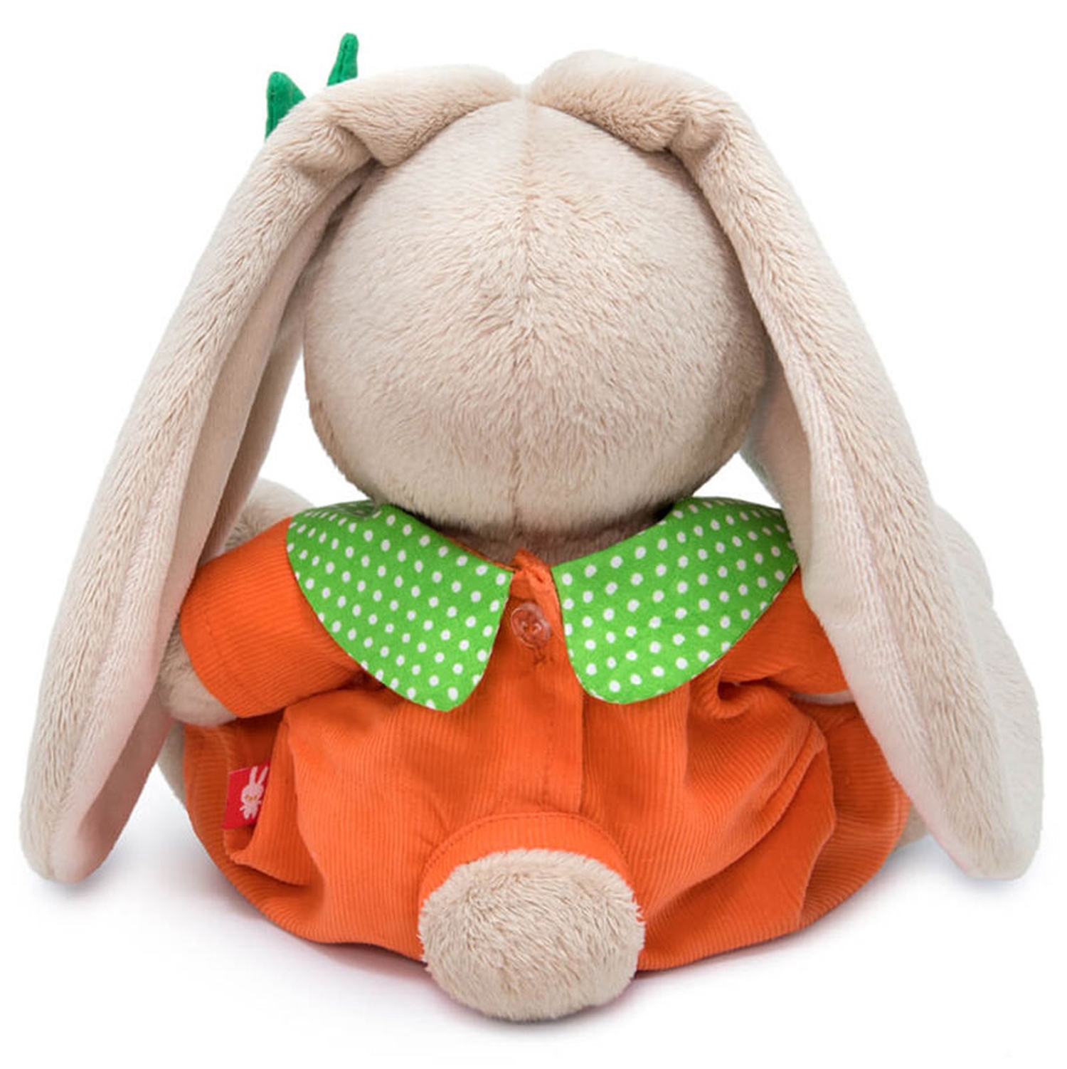 Малыш Зайка в комбинезоне из микровельвета тыквенного цвета, круглый воротничок из х/б зеленой ткани в белый горошек. Спереди комбинезон украшен белым атласным бантиком. На ушке у Зайки украшение в виде морковки, выполненной вручную из х/б ткани.