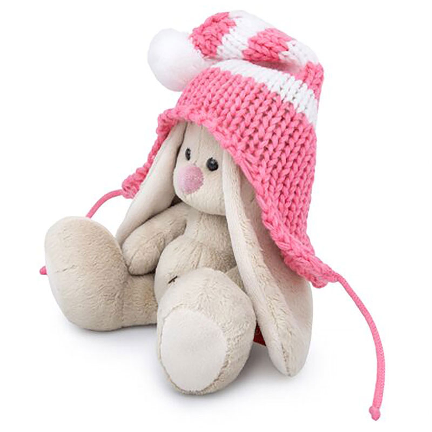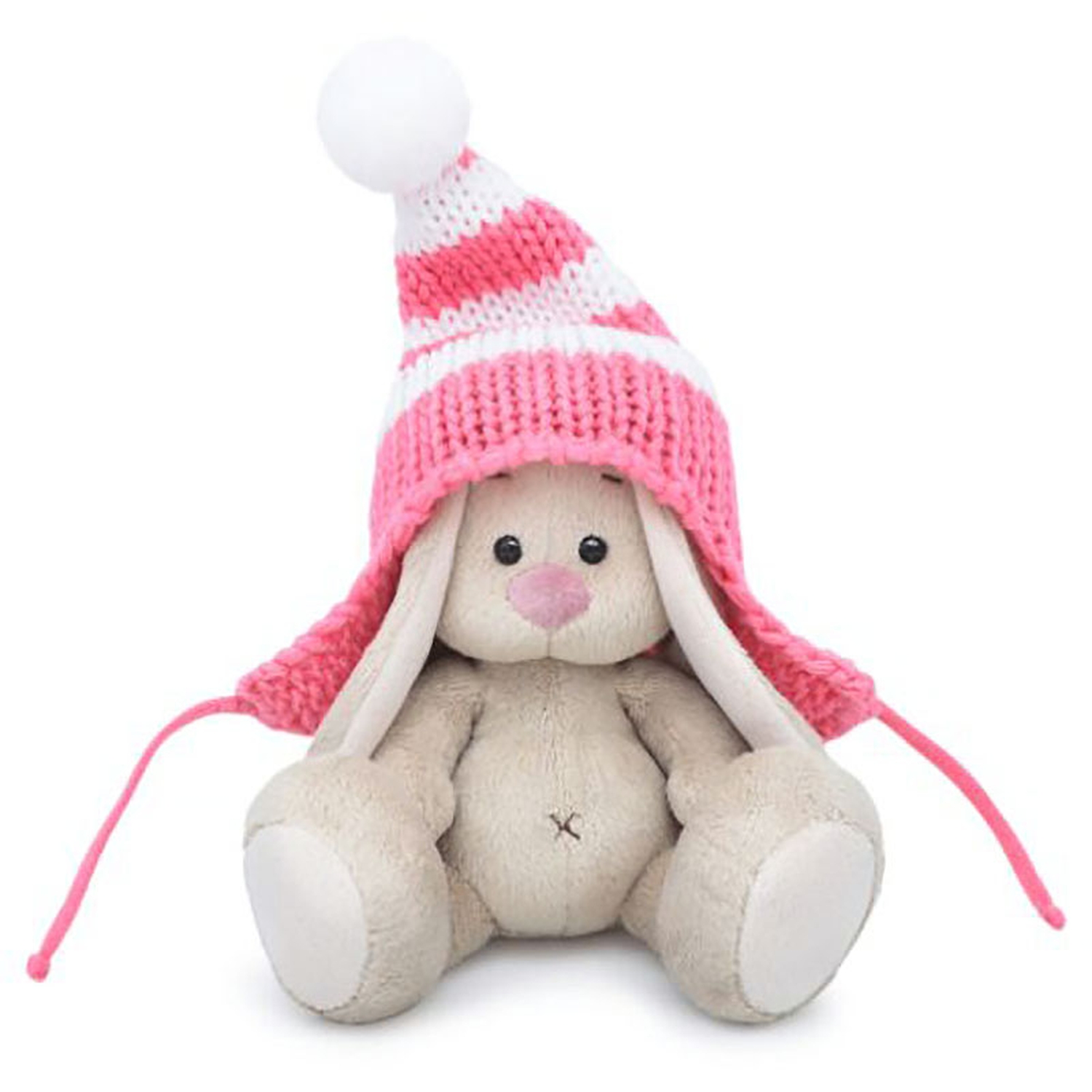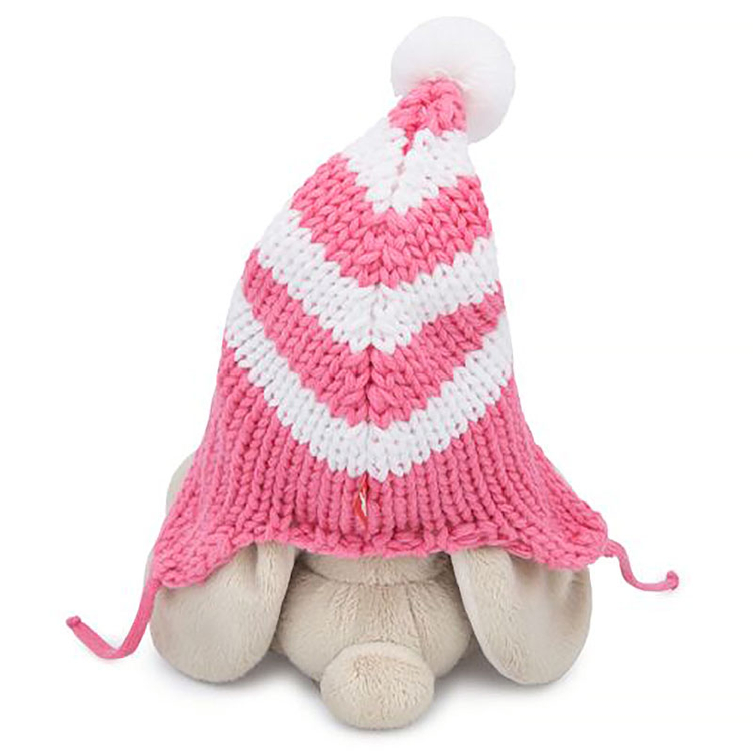 Малыш Зайка в забавной вязаной шапочке-колпачке с помпоном и завязками.