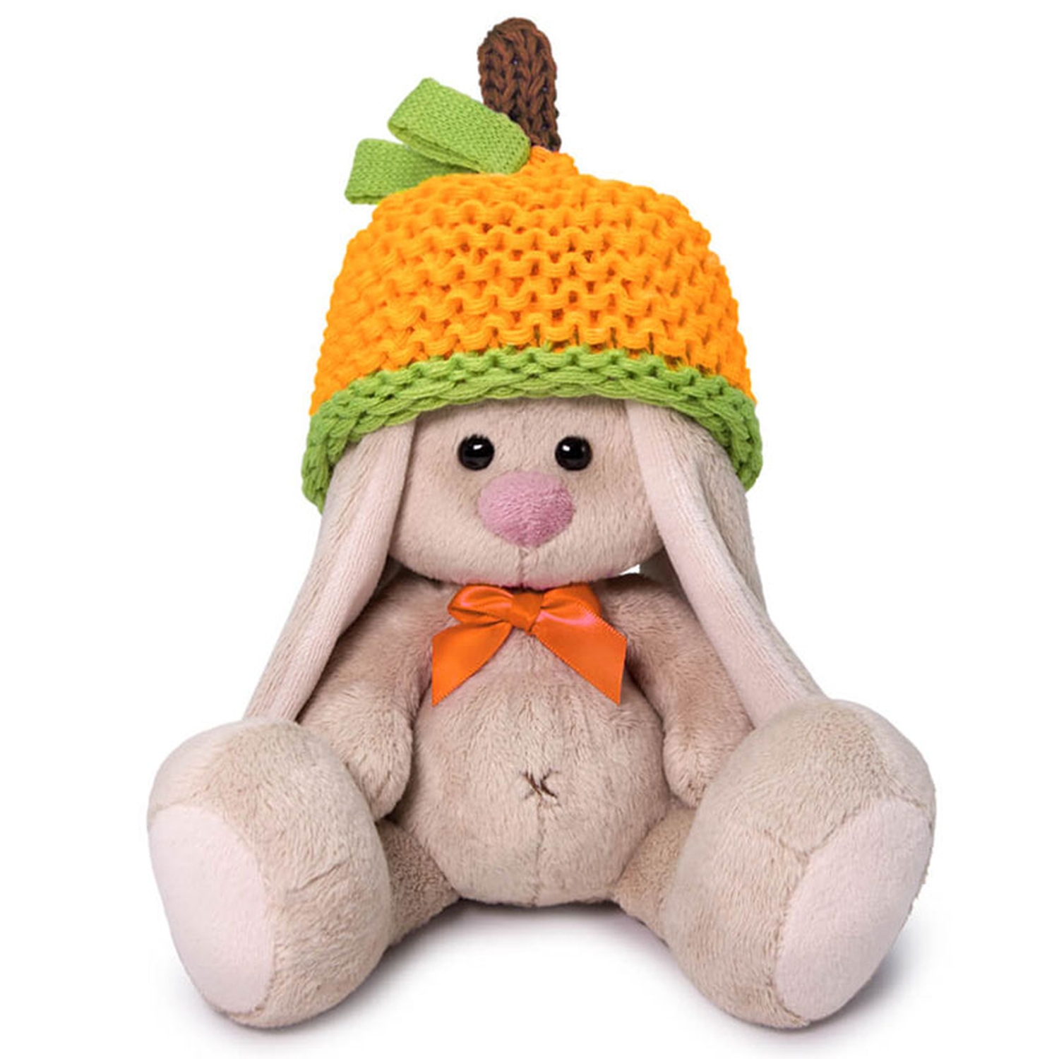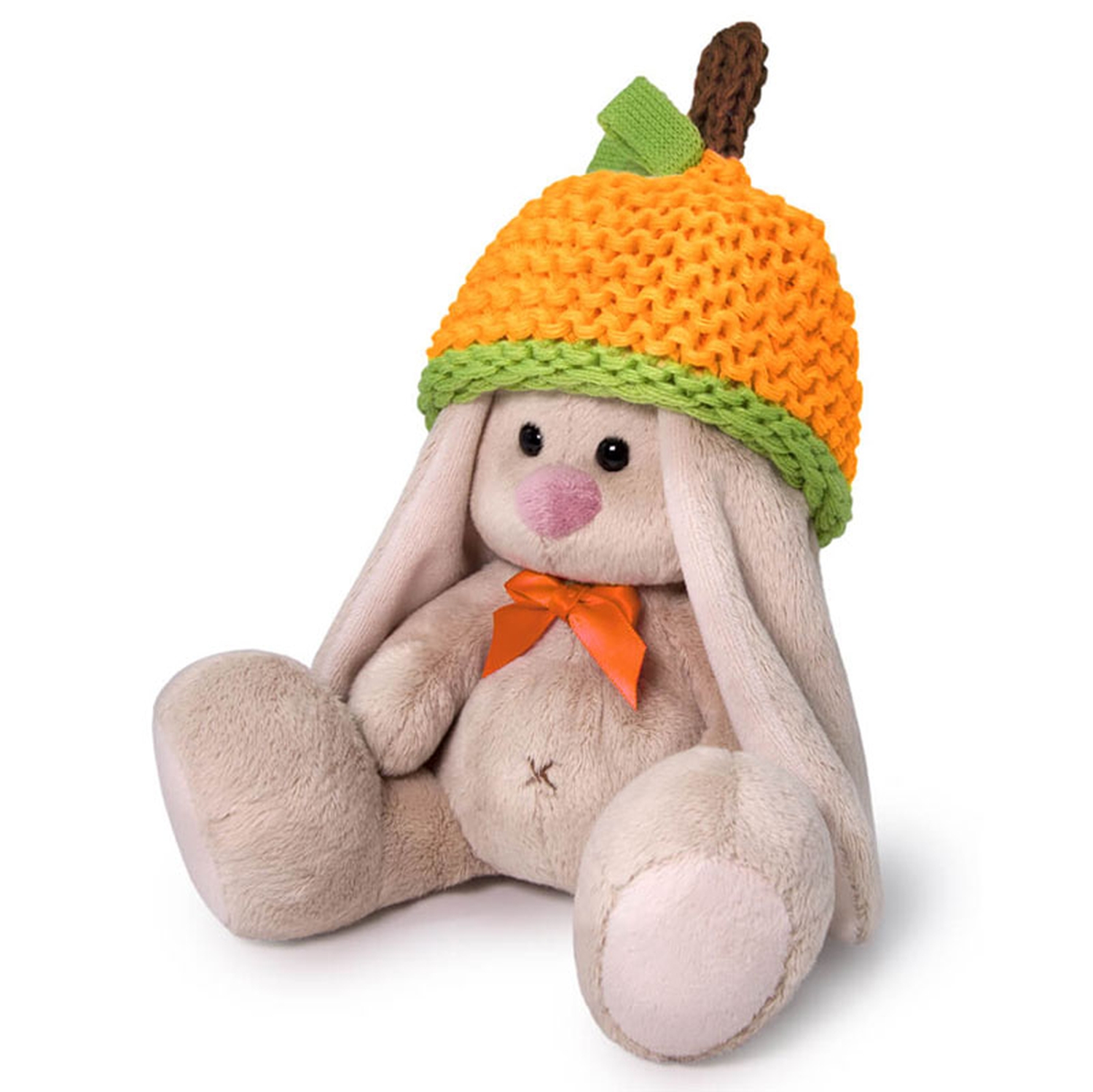 Зайка в забавной вязаной шапочке «Мандарин». Также в комплекте атласный бант оранжевого цвета.
