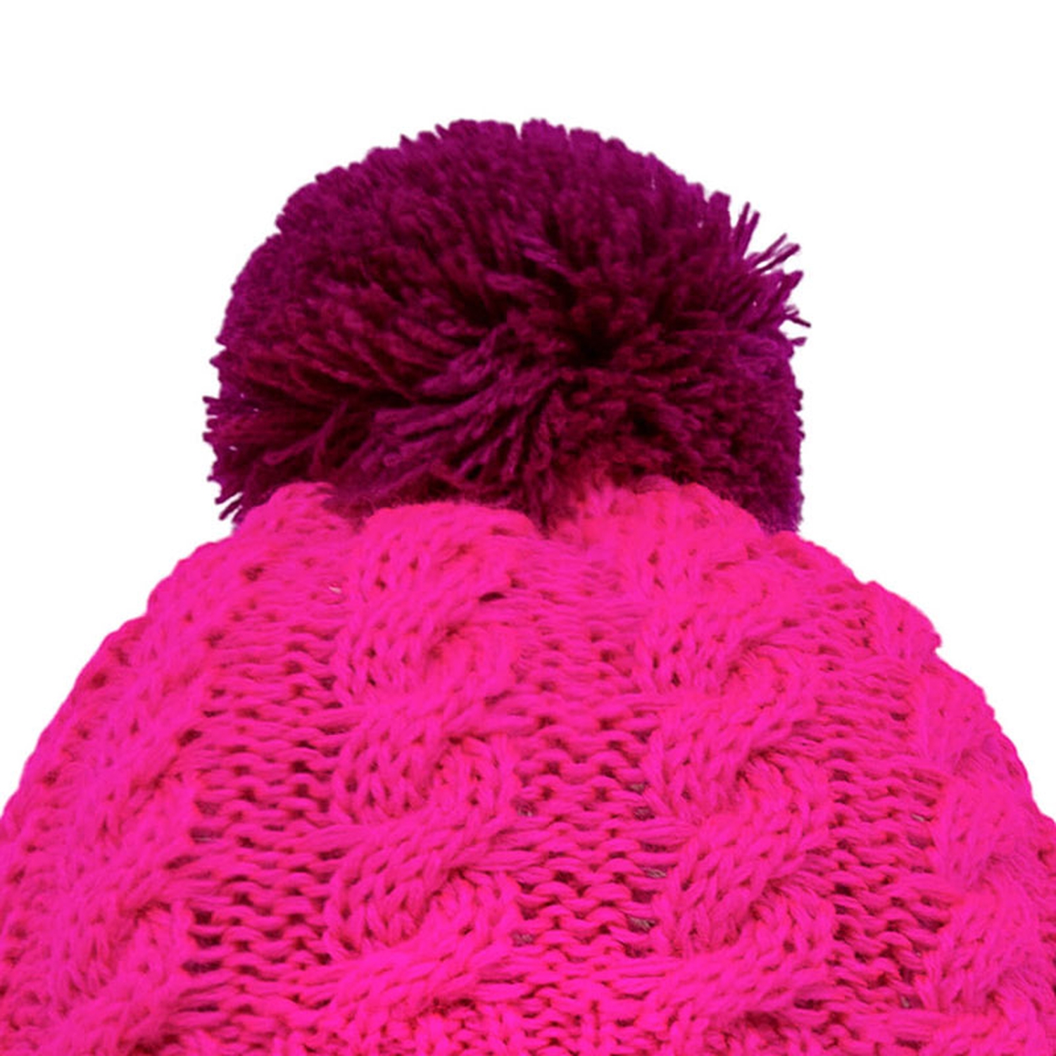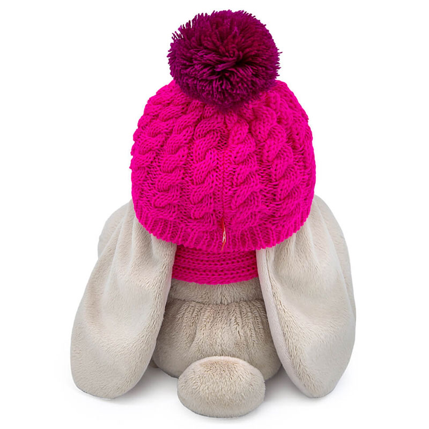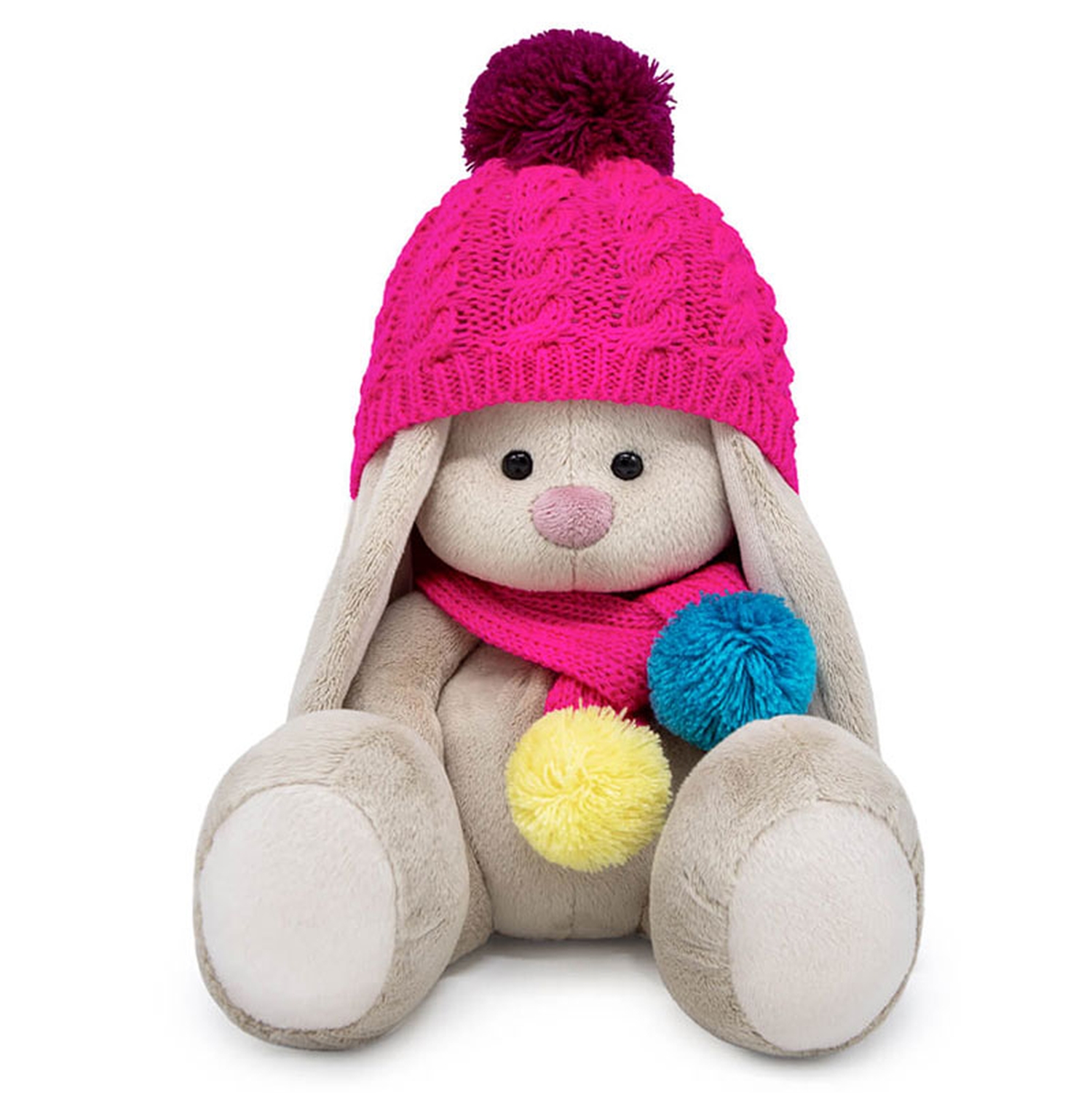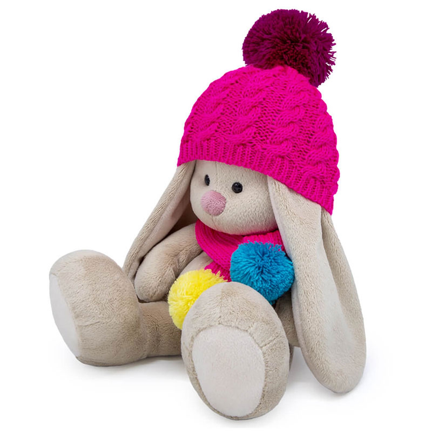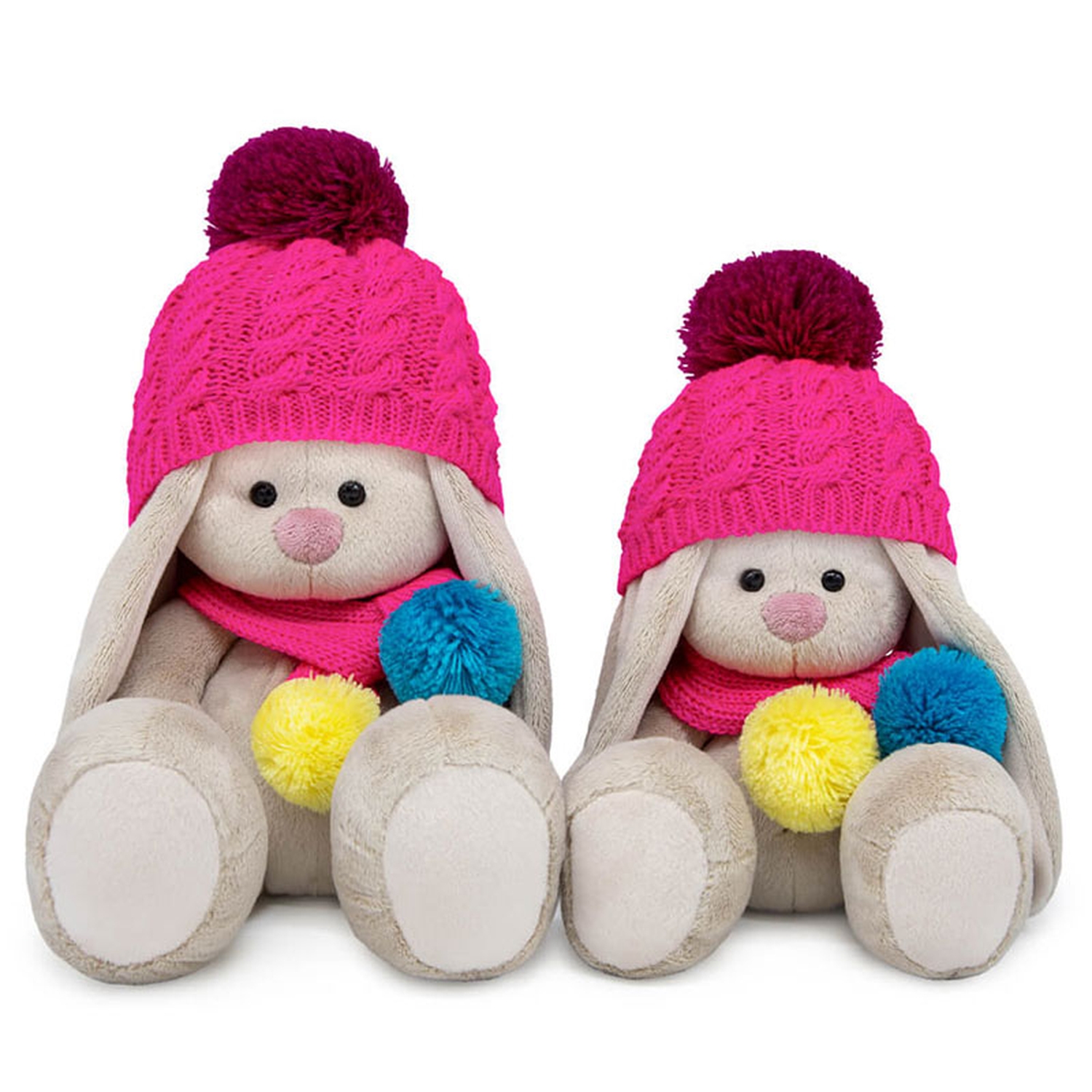 На Зайке Ми яркий вязаный комплект, шапочка цвета фуксии с вишневым помпоном. Также в комплекте шарфик с двумя объемными помпонами лимонного и лазурного синего цвета.