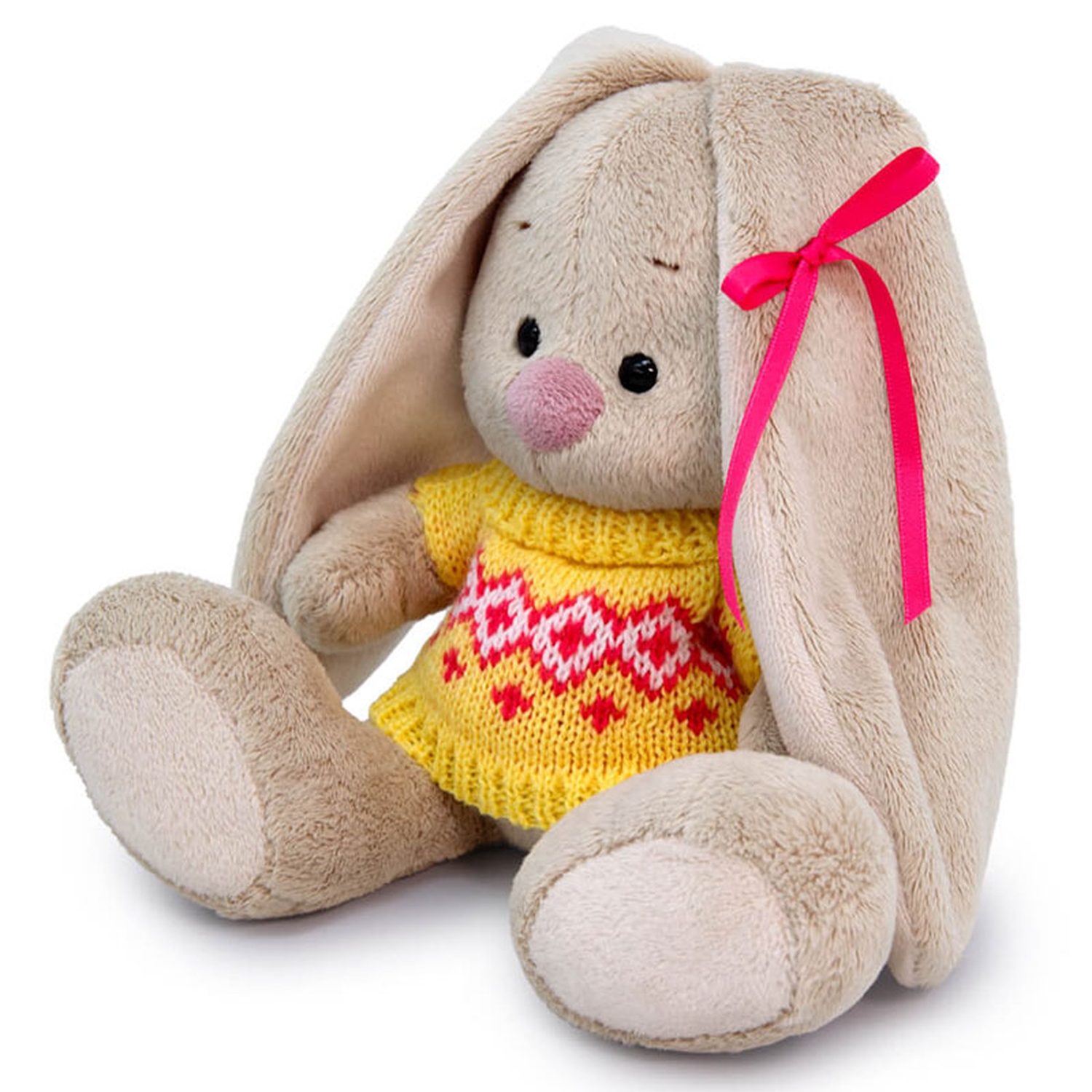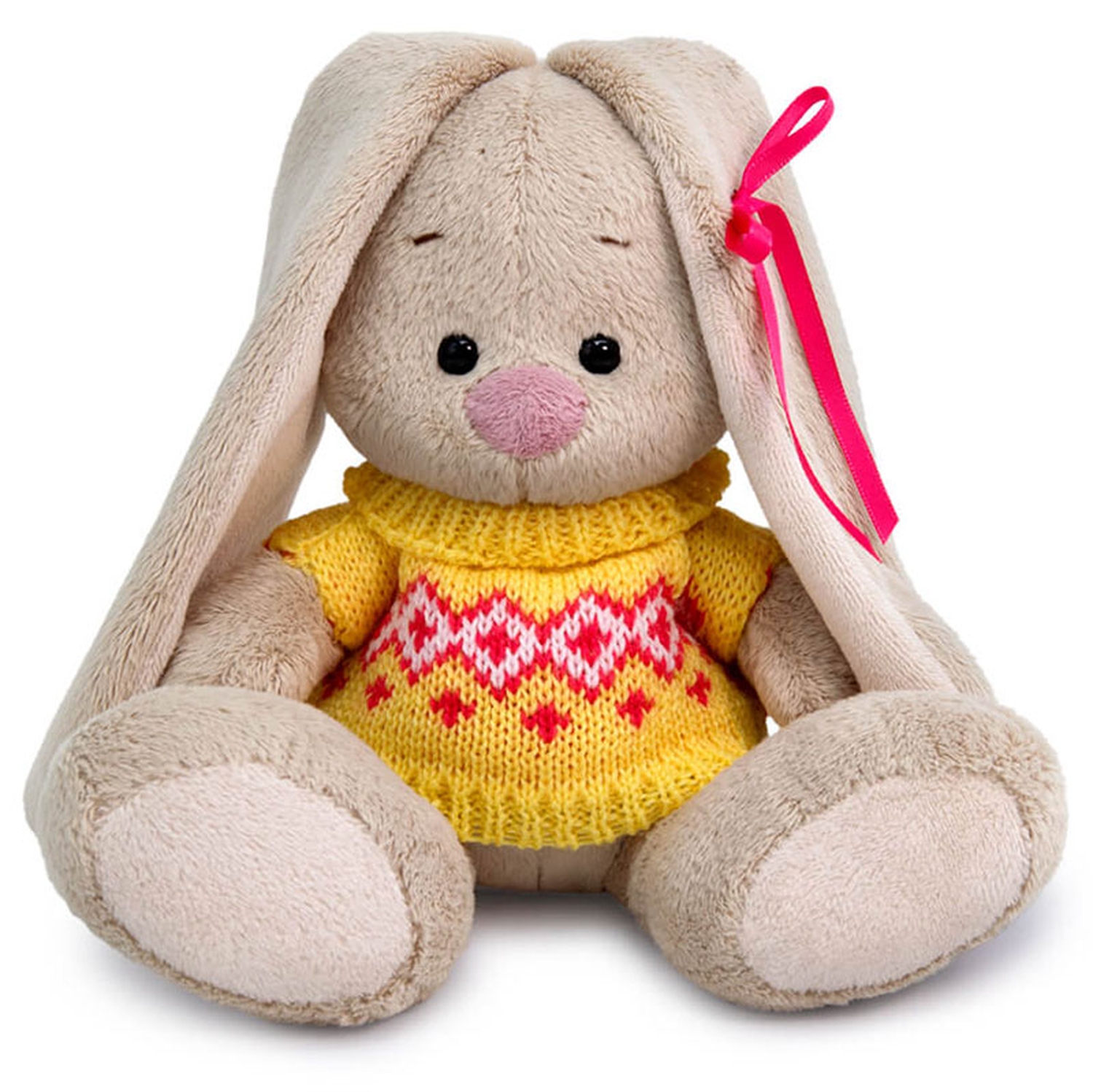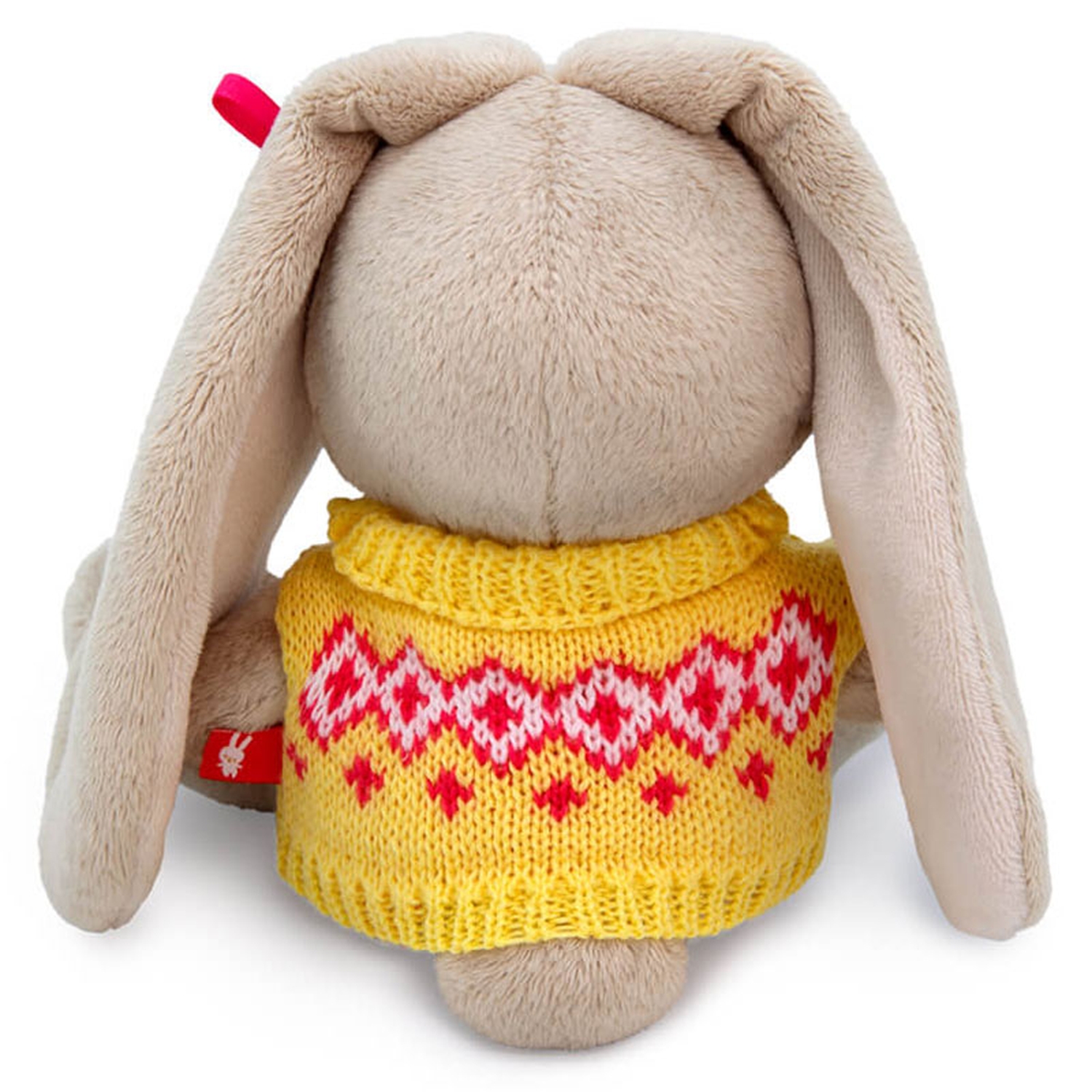 На малыше Зайке Ми шикарный вязанный жилет со спущенным рукавчиком. Жилет из нежного акрила цвета мимозы с ромбовидным орнаментом спереди. На ушке у Зайки атласный бантик цвета розового пиона.