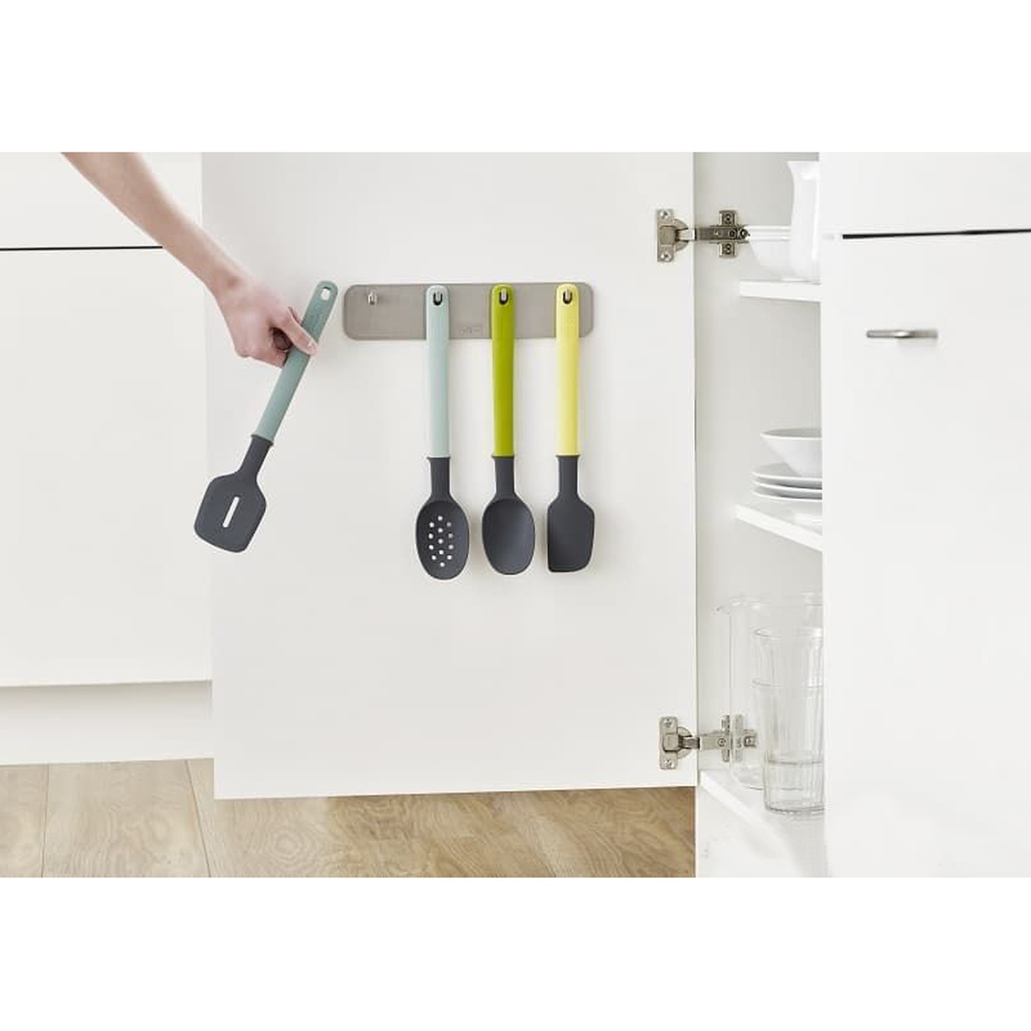Набор из 4 принадлежностей DoorStore поможет рационально распределить пространство внутри кухонного шкафа. Торговая марка Joseph Joseph порадовала современных хозяек креативной задумкой крепления стеллажа с приборами на задней части двери. Линейка Elevate создана для сохранения чистоты на кухонных поверхностях во время приготовления пищи. Особенность инструментов заключается в конструкции ручек. Они имеют специальную подставку и встроенный утяжелитель, который позволяет испачканной части прибора всегда оставаться на весу. В набор входит 4 предмета с цветными силиконовыми ручками: поварская ложка ложка-шумовка лопатка лопатка-шумовка Также в комплекте есть держатель для приборов, который снабжен клейкой лентой 3M VHB, обеспечивающей надежное крепление на плоской поверхности. Все кухонные принадлежности подходят для посуды с тефлоновым покрытием и мытья в посудомоечной машине.