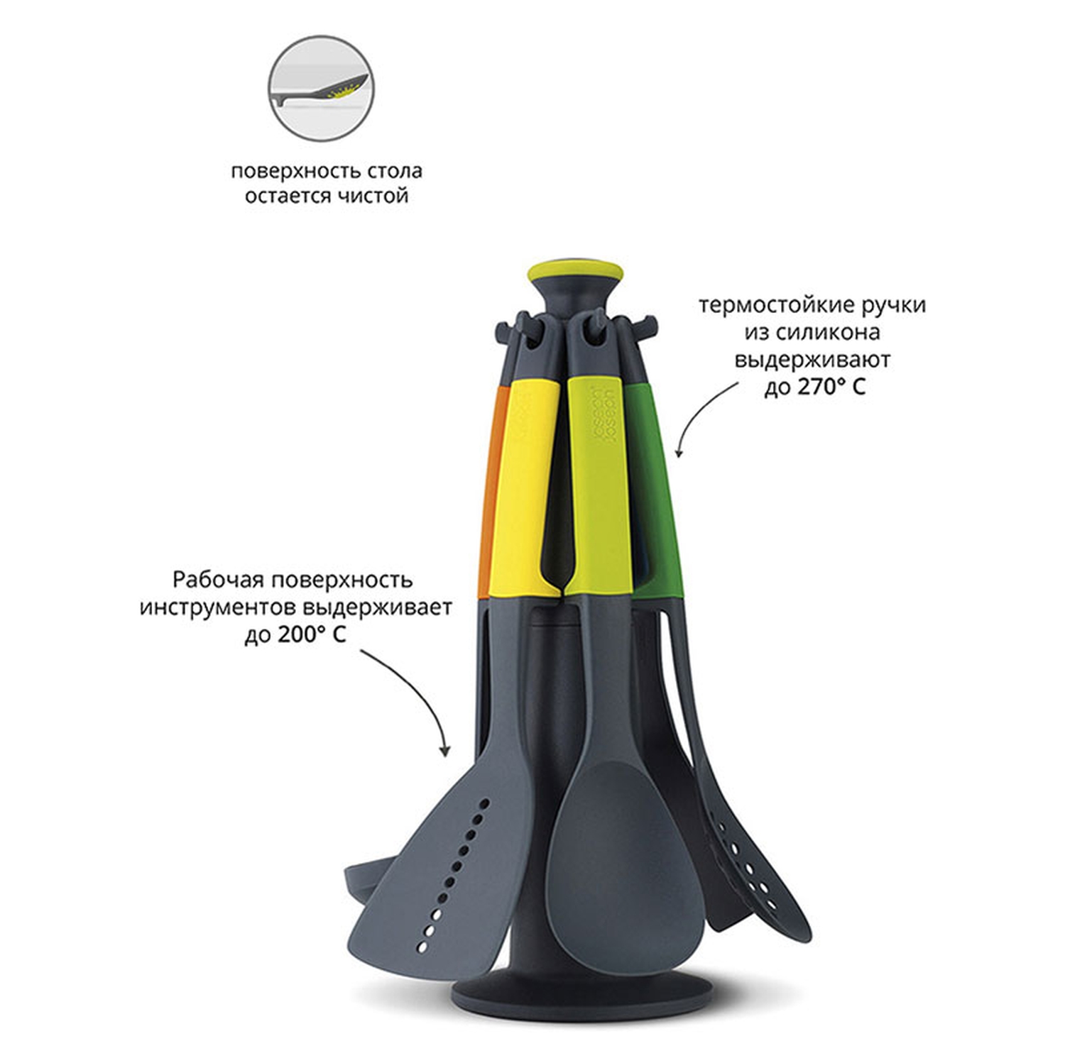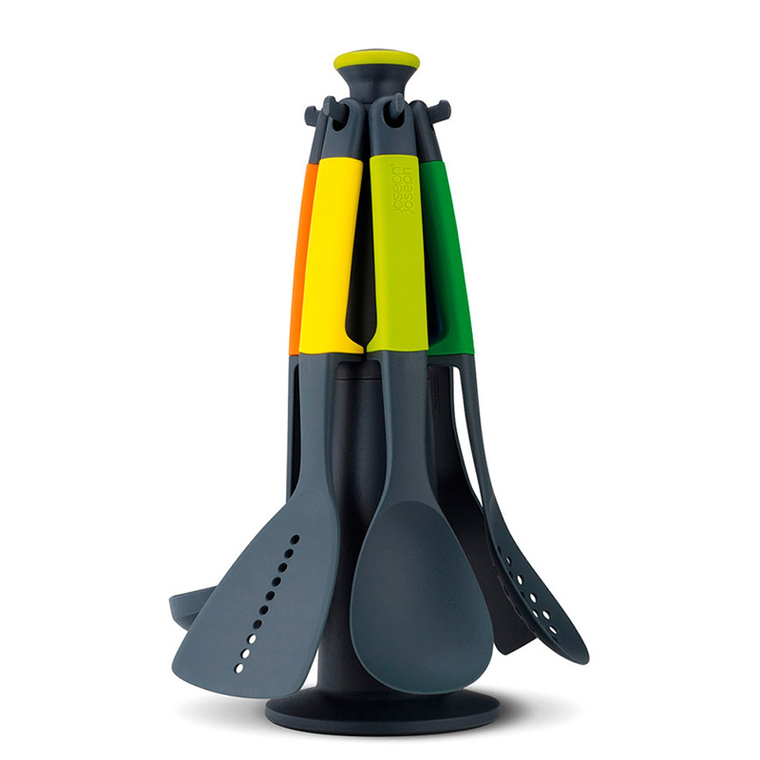 Набор кухонных инструментов на вращающейся подставке. Запатентованный дизайн Joseph Joseph. Входит в серию кухонных приборов Elevate, разработанную с целью минимизировать беспорядок во время готовки. Каждый прибор оснащен инновационной утяжеленной ручкой, благодаря которой испачканная часть инструмента всегда остается навесу и не касается рабочей поверхности. Рабочая поверхность инструментов выдерживает до 200 С, эргономичные термостойкие ручки из силикона — до 270 С. Подходят для совместного использования с противопригарной посудой. Удобная вращающаяся подставка с нескользящим основанием обеспечит легкий доступ к нужному прибору. В набор входит: — ложка — ложка для спагетти — лопатка — лопатка-шумовка — ложка-шумовка — половник — подставка.
