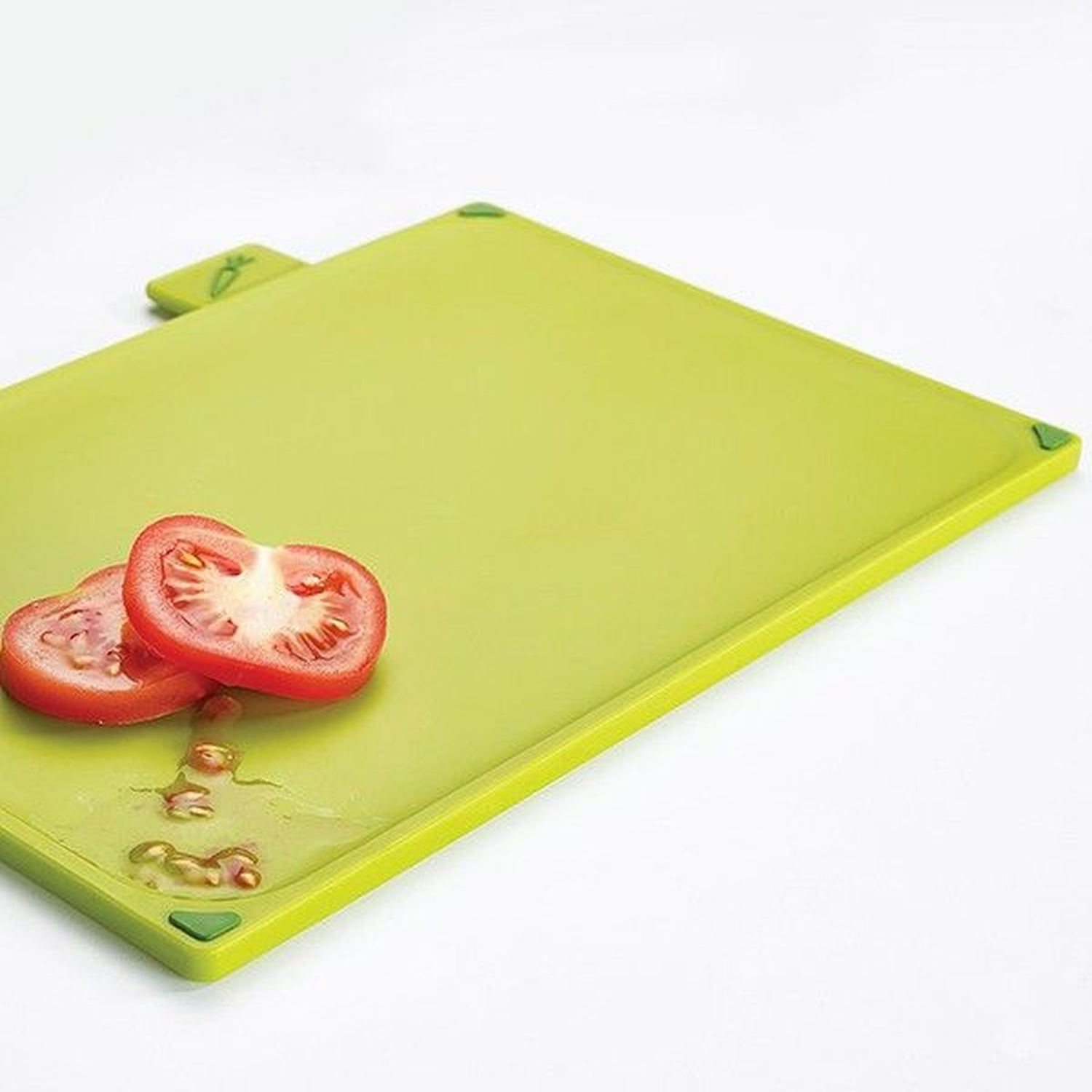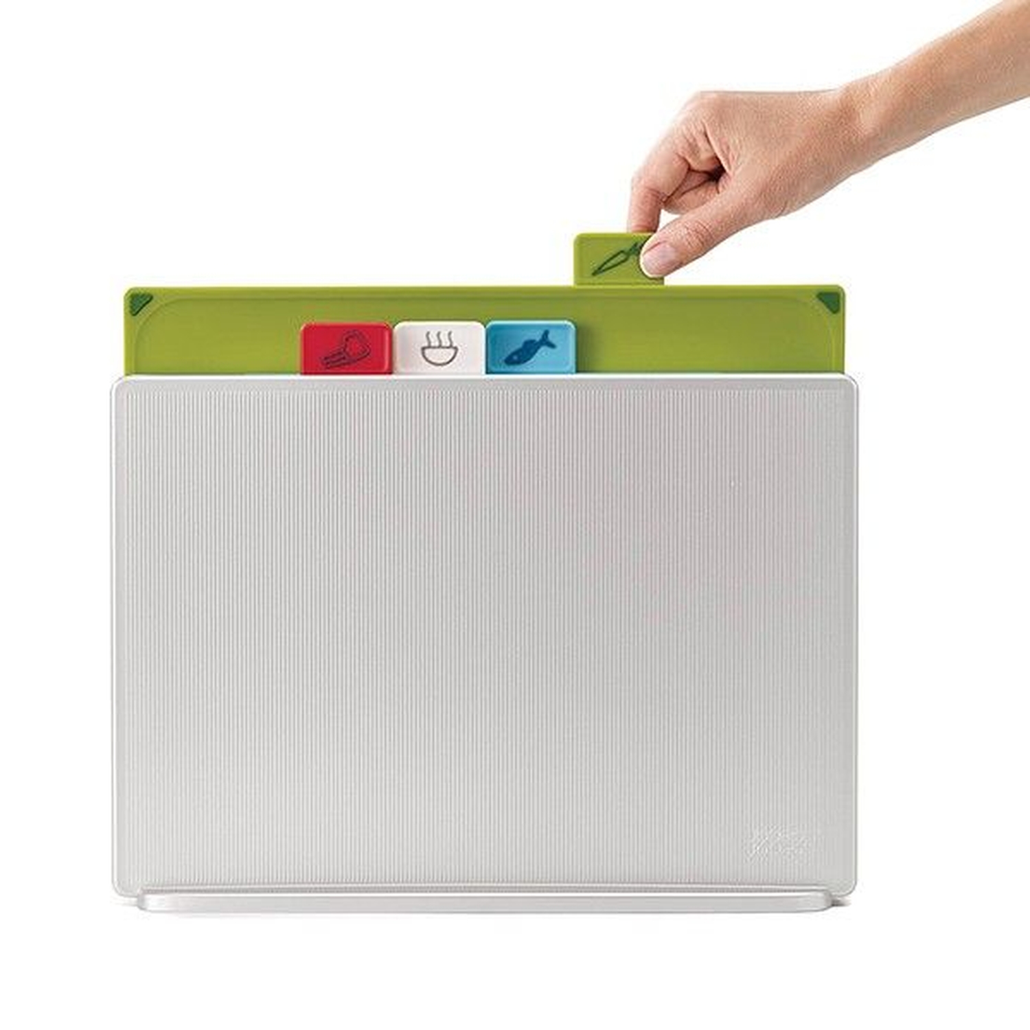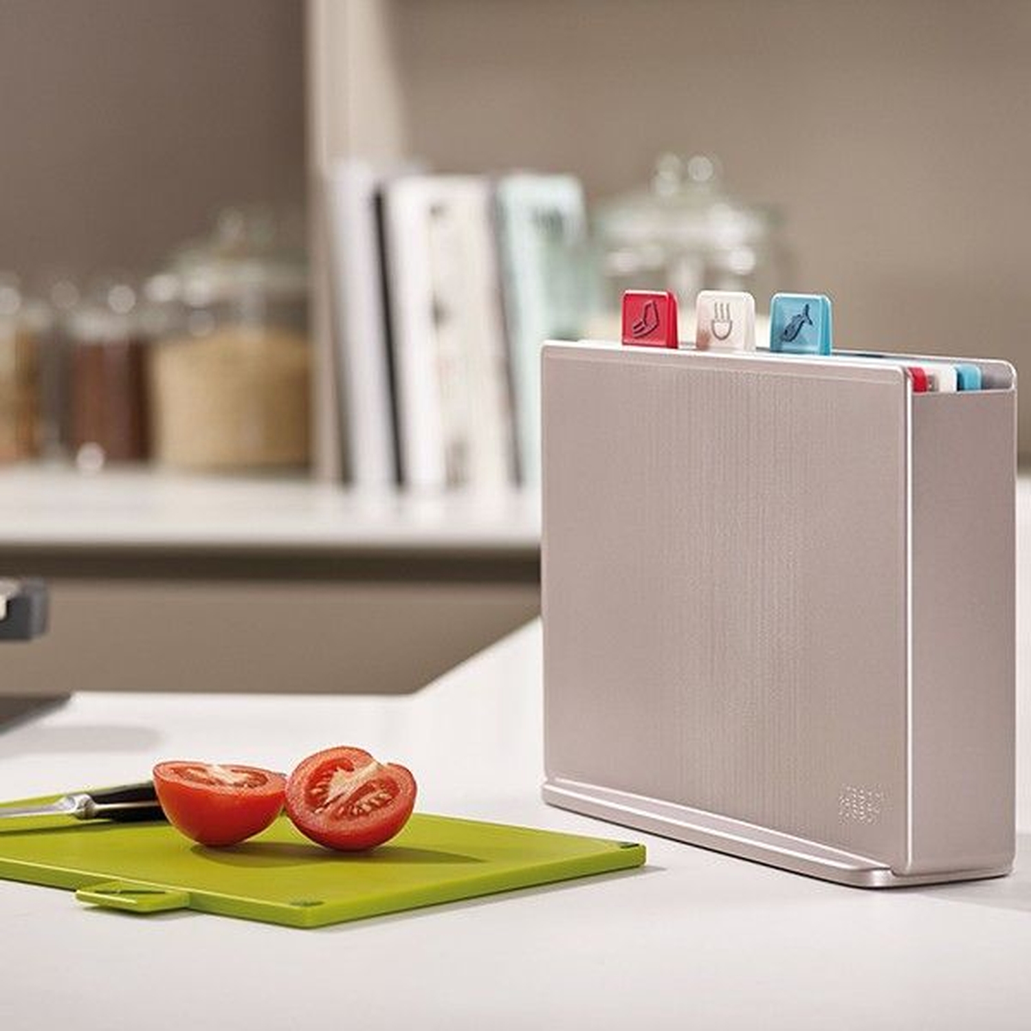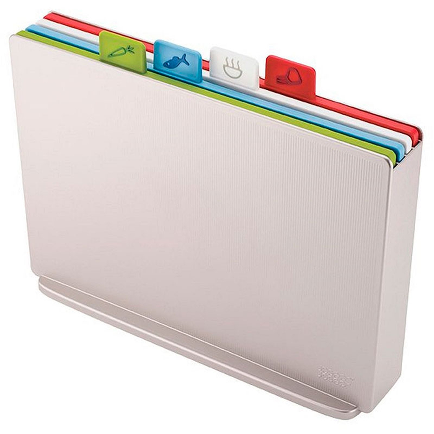 Новая интерпретация бестселлера Index. Теперь все доски в наборе с одинаковой плоской поверхностью и закругленными краями, удерживающими сок и крошки. Доски из этого набора можно использовать с двух сторон, не задумываясь. Благодаря обновленной форме кейса набор занимает еще меньше места и вписывается в современные интерьеры кухонь. Простая и вместе с тем эффективная маркировка позволяет легко распределять доски для разных типов продуктов, сохраняя максимальную гигиену в процессе нарезки и исключая взаимное загрязнение продуктов. Специальные ярлыки помогают определить какую доску следует использовать для разных ингредиентов: сырого мяса, овощей, рыбы или же хлеба. Силиконовые ножки на досках препятствуют скольжению. Инновационное покрытие досок не дает ножам затупиться. Размер разделочных досок: длина 34, высота 25, диагональ 42 см.