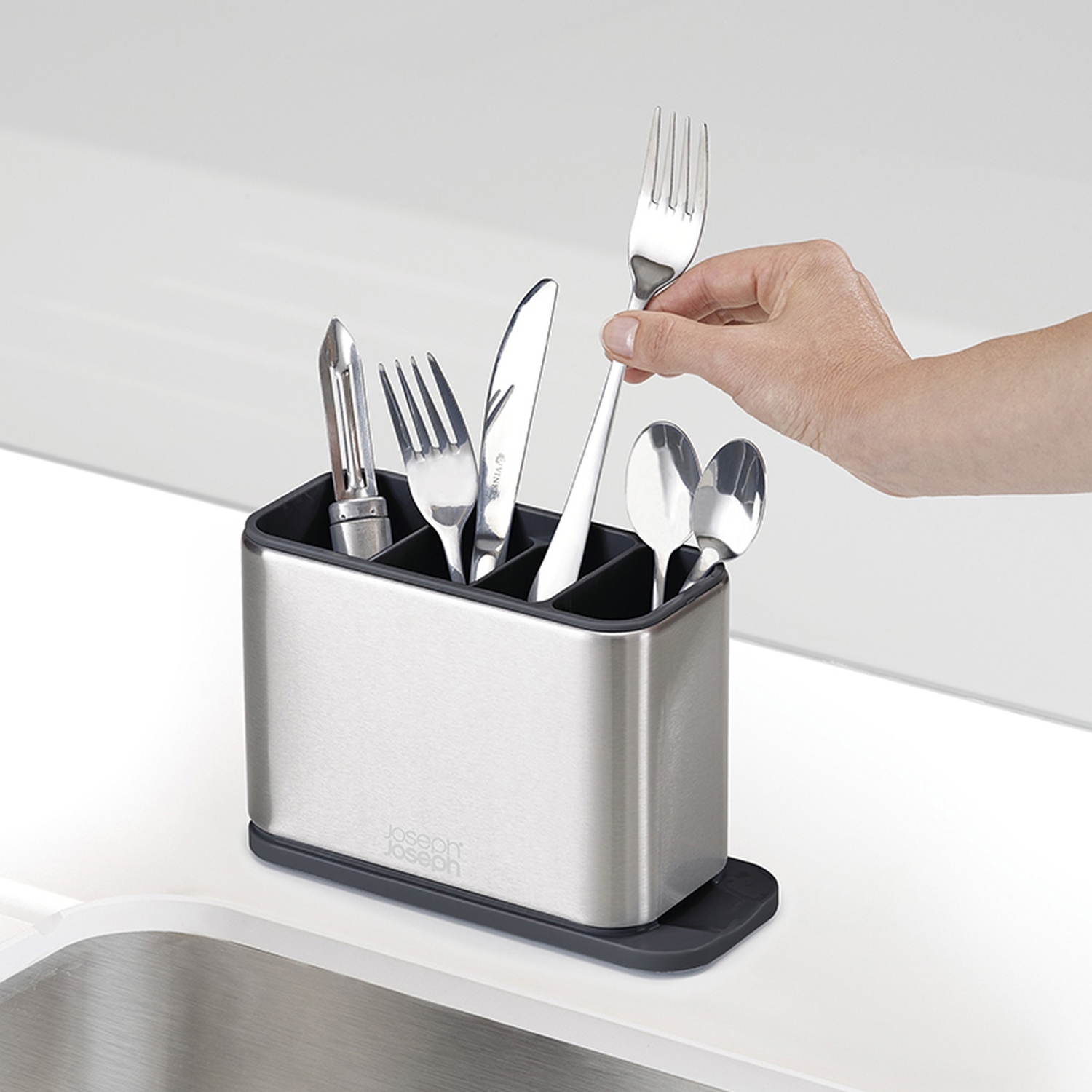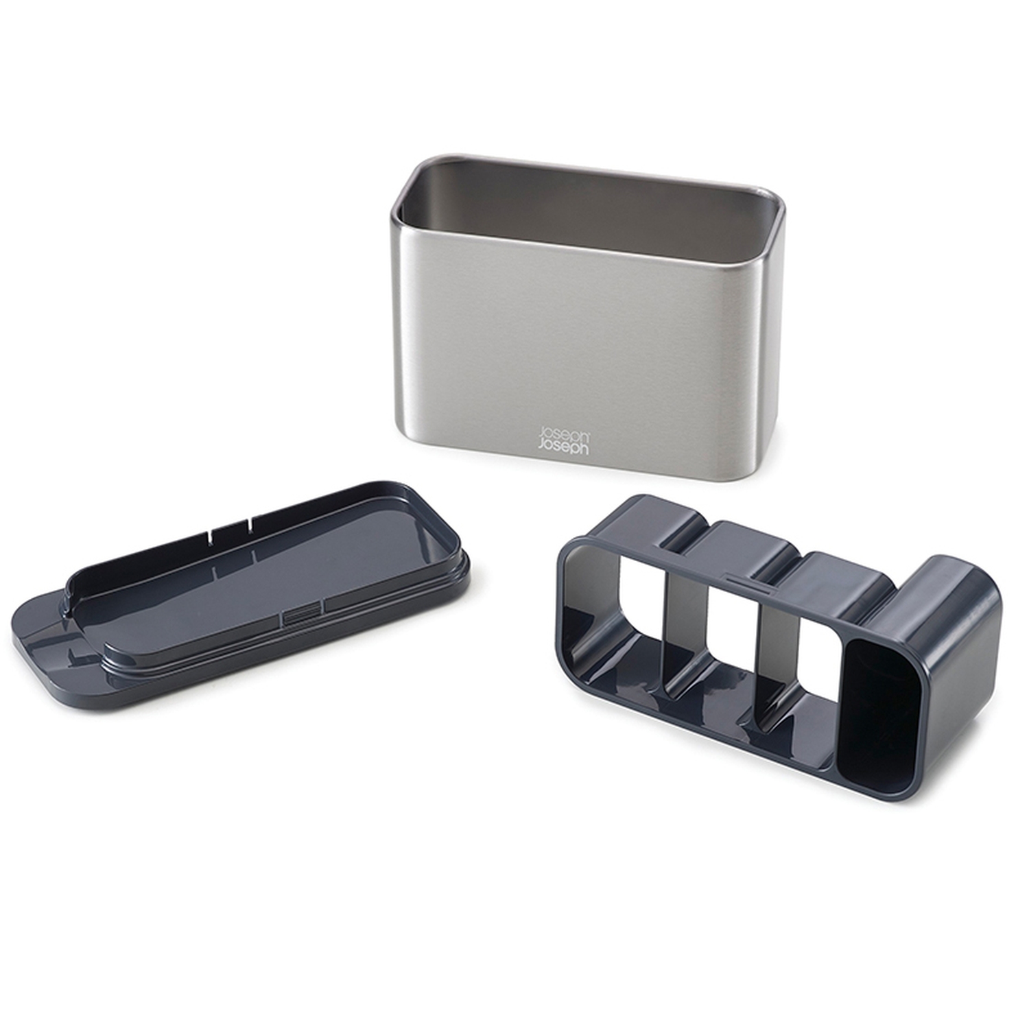 Вместительный органайзер для сушки столовых приборов выполнен из пластика и нержавеющей стали. Отличается большой вместительностью при компактном размере благодаря разделению на сегменты под каждый вид столовых приборов. Дополнительно предусмотрен специальный отсек для мелких предметов. Вода со столовых приборов свободно стекает через встроенный слив. Органайзер просто разбирается и легко моется. Нескользящие ножки обеспечивают хорошую устойчивость на любой поверхности. Коллекция Surface современное решение для организации рабочего пространства кухни. Все предметы коллекции изготовлены из пластика с отделкой из стали класса SS430, хорошо известной своими антикоррозийными свойствами.