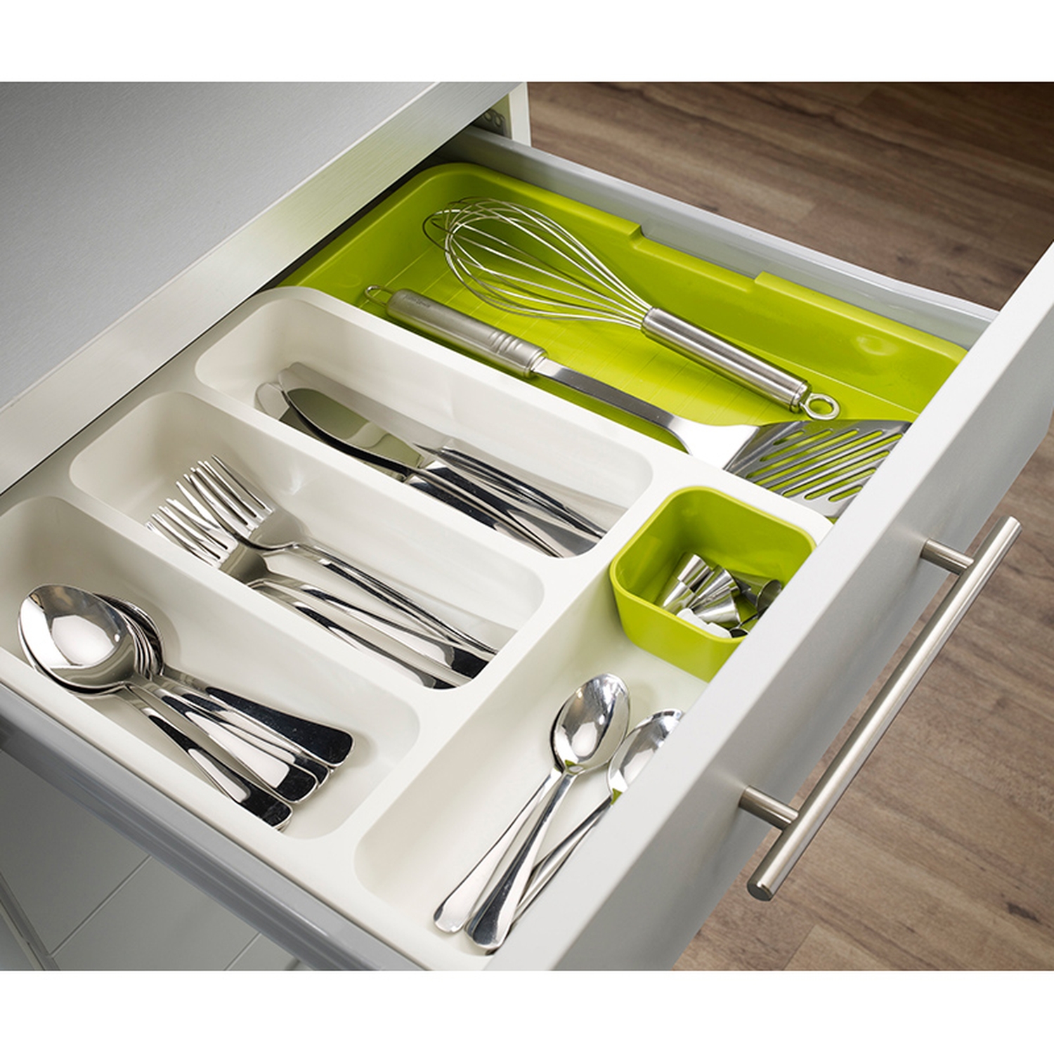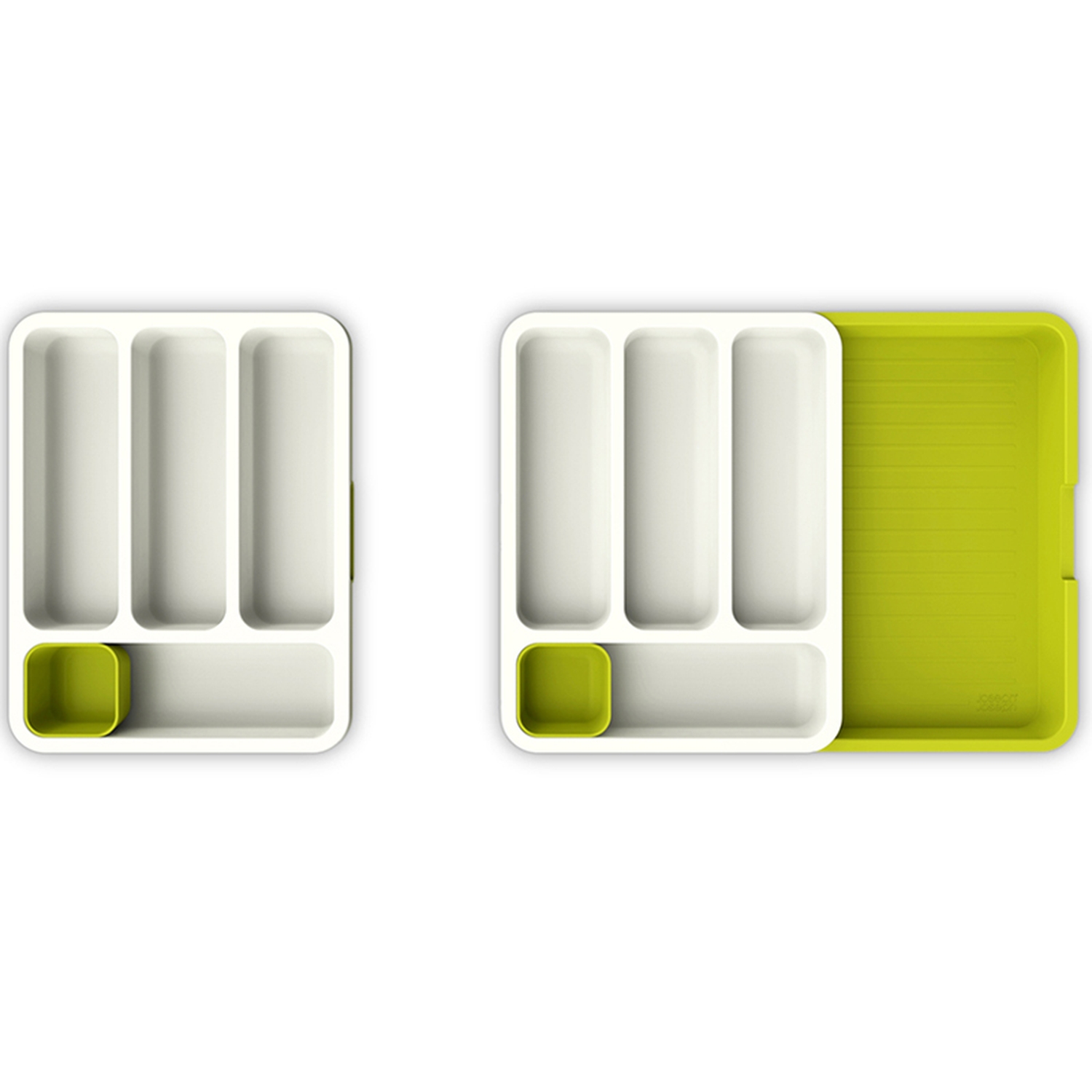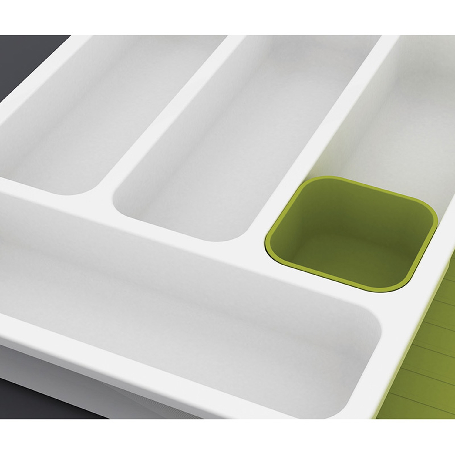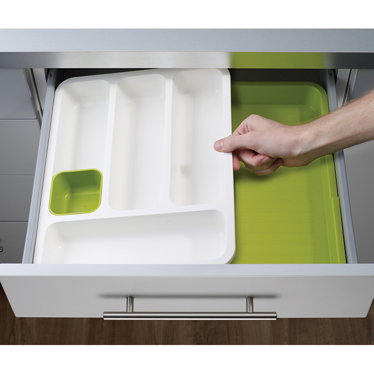 Практичное решение для размещения столовых приборов в идеальном порядке. Две съёмные части лотка регулируются под кухонные ящики самых разных размеров и надёжно закрепляются в нужном положении. Органайзер состоит из четырёх глубоких ячеек для ложек и вилок, вместительного отделения для ножей и крупных кухонных инструментов, а также небольшого съёмного контейнера для различных мелочей. Подходит для кухонных ящиков шириной от 29 см. до 48 см. Мыть рекомендуется только вручную.