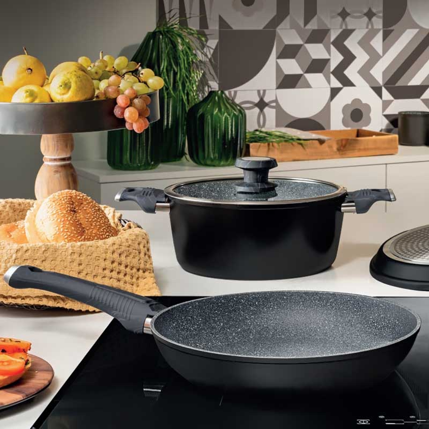 Корпус посуды выполнен из литого алюминия и основания из теплоизлучающей стали высокой толщины. Внутренняя поверхность посуды покрыта 4-х слойным антипригарным покрытием с эффектом гранита. Для всех видов плит, включая индукцию.
