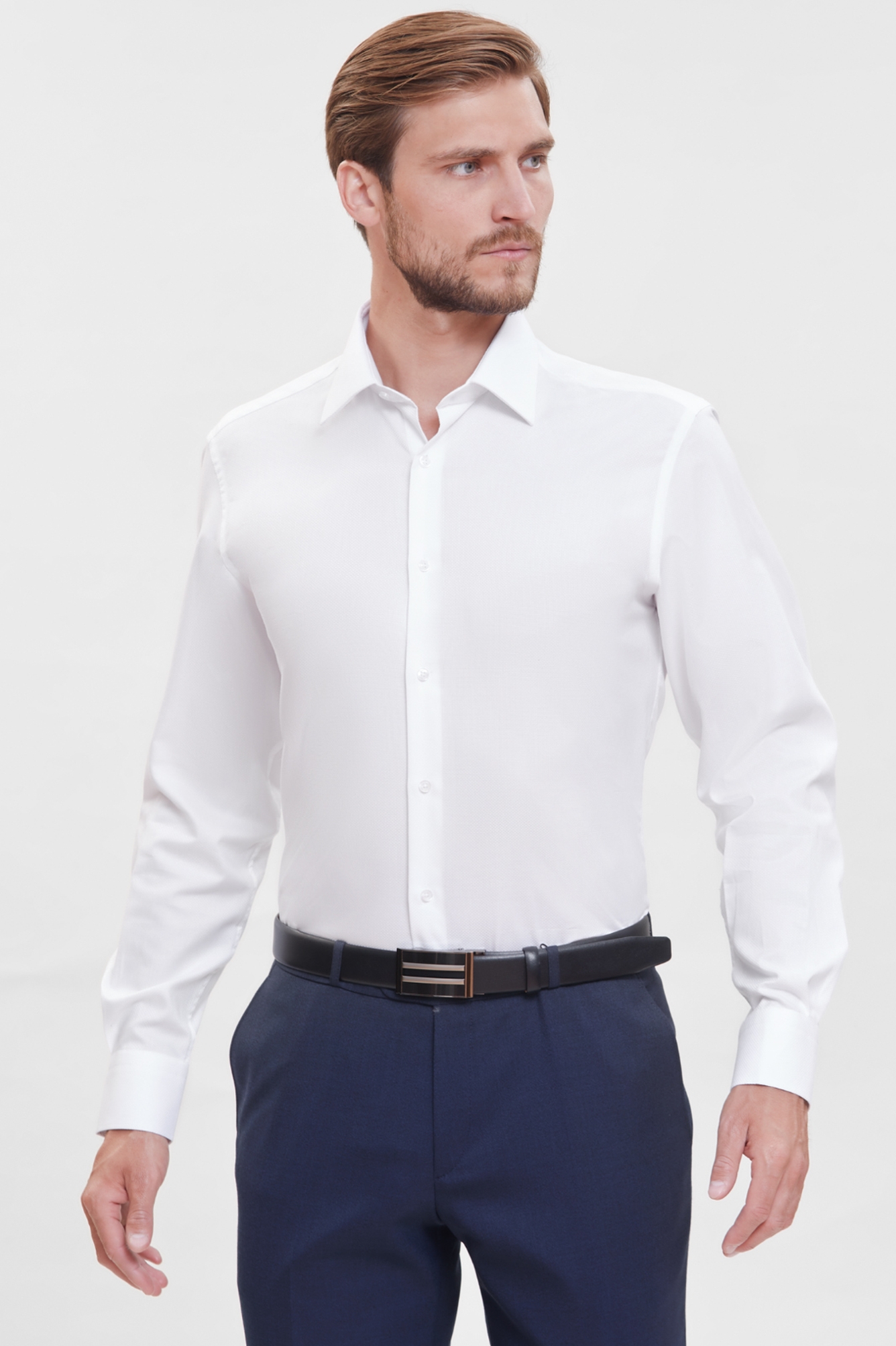 Белая сорочка KANZLER из плотной фактурной хлопковой ткани — вневременная классика, базовая и необходимая вещь делового гардероба. Модель освежит офисный стиль и создаст торжественный и праздничный образ. Безупречный вид задан элегантным, чуть приталенным силуэтом и минималистичным кроем. Плотность прилегания манжеты регулируется. Благородный натуральный материал выглядит роскошно. Мягкая легкая ткань из чистого хлопка дарит бескомпромиссный комфорт и свежесть. От рассвета до заката сорочка сохраняет аккуратный вид и первозданную форму. Материал: