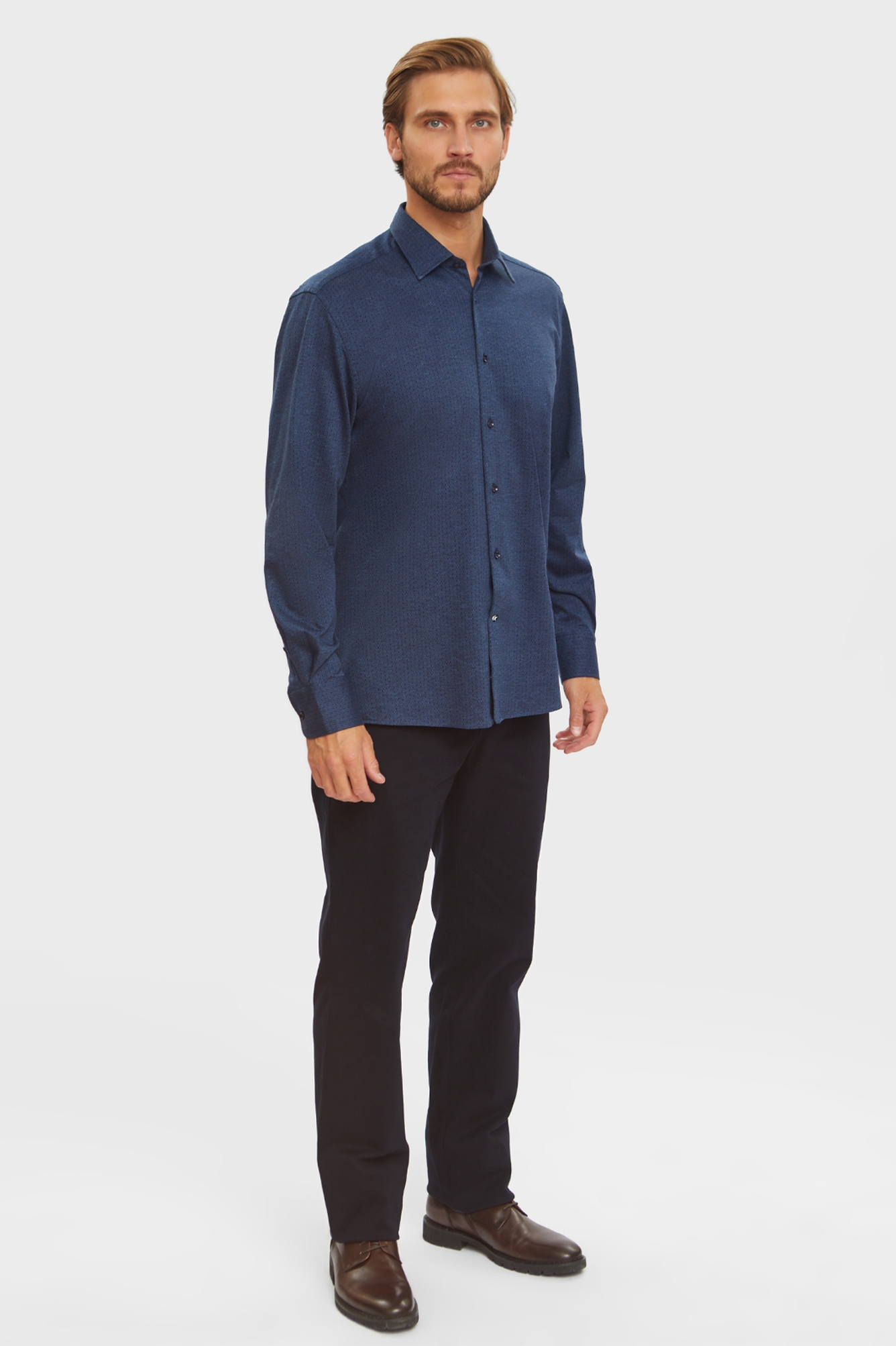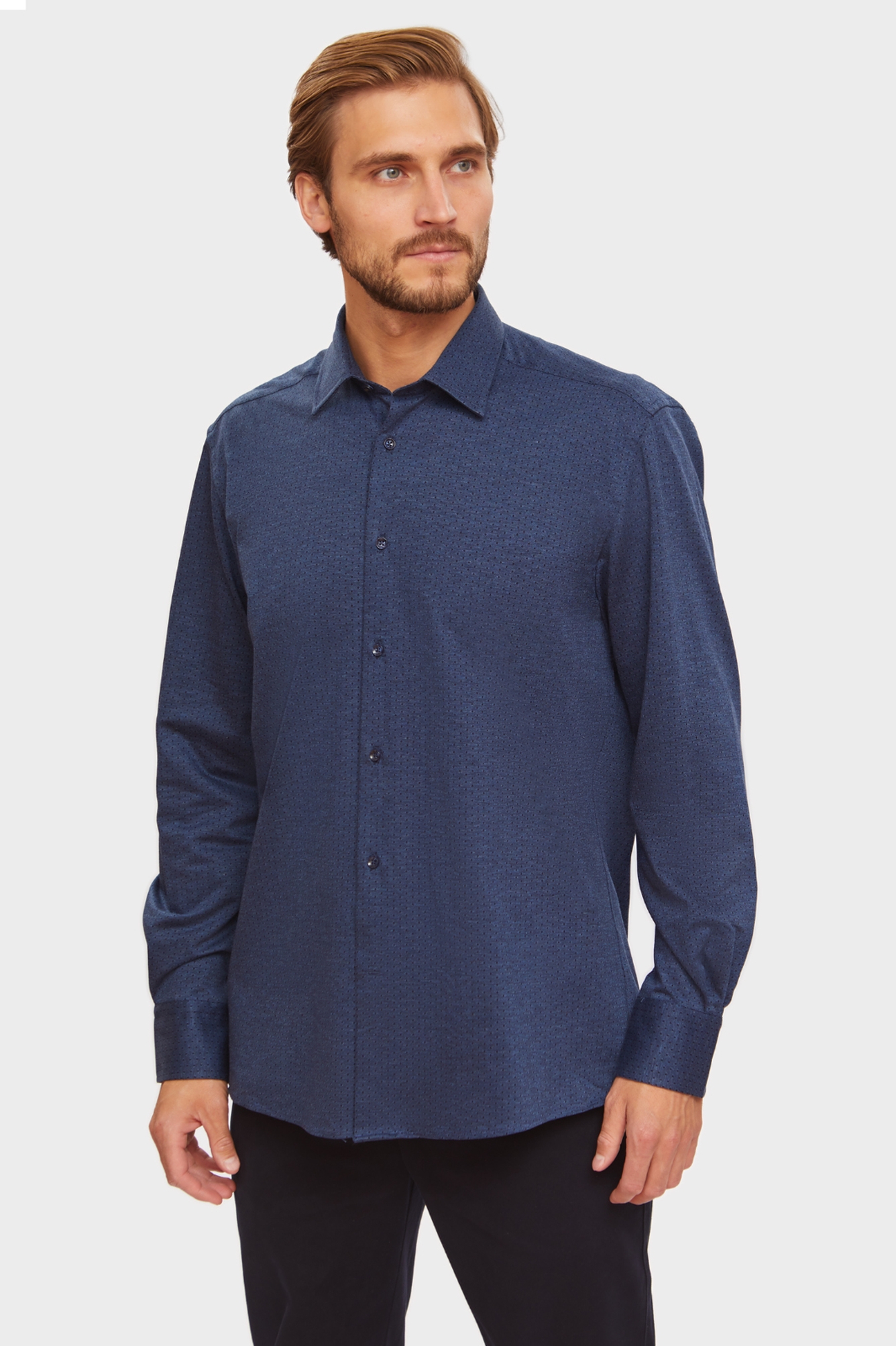 Сорочка KANZLER из натурального хлопка насыщенного синего оттенка с микропринтом — отличный выбор для делового гардероба. Роскошная и в меру строгая модель. Трендовая расцветка гармонично сочетается с черными, коричневыми и синими брюками, а удобный крой regular fit подойдет для любого типа фигуры. Две пуговицы на манжете позволяют легко регулировать степень прилегания рукава. Мягкий и воздухопроницаемый материал из натурального хлопка обеспечит комфорт на целый день. Плотное переплетение нитей гарантирует прочность и долговечность сорочки. Материал: