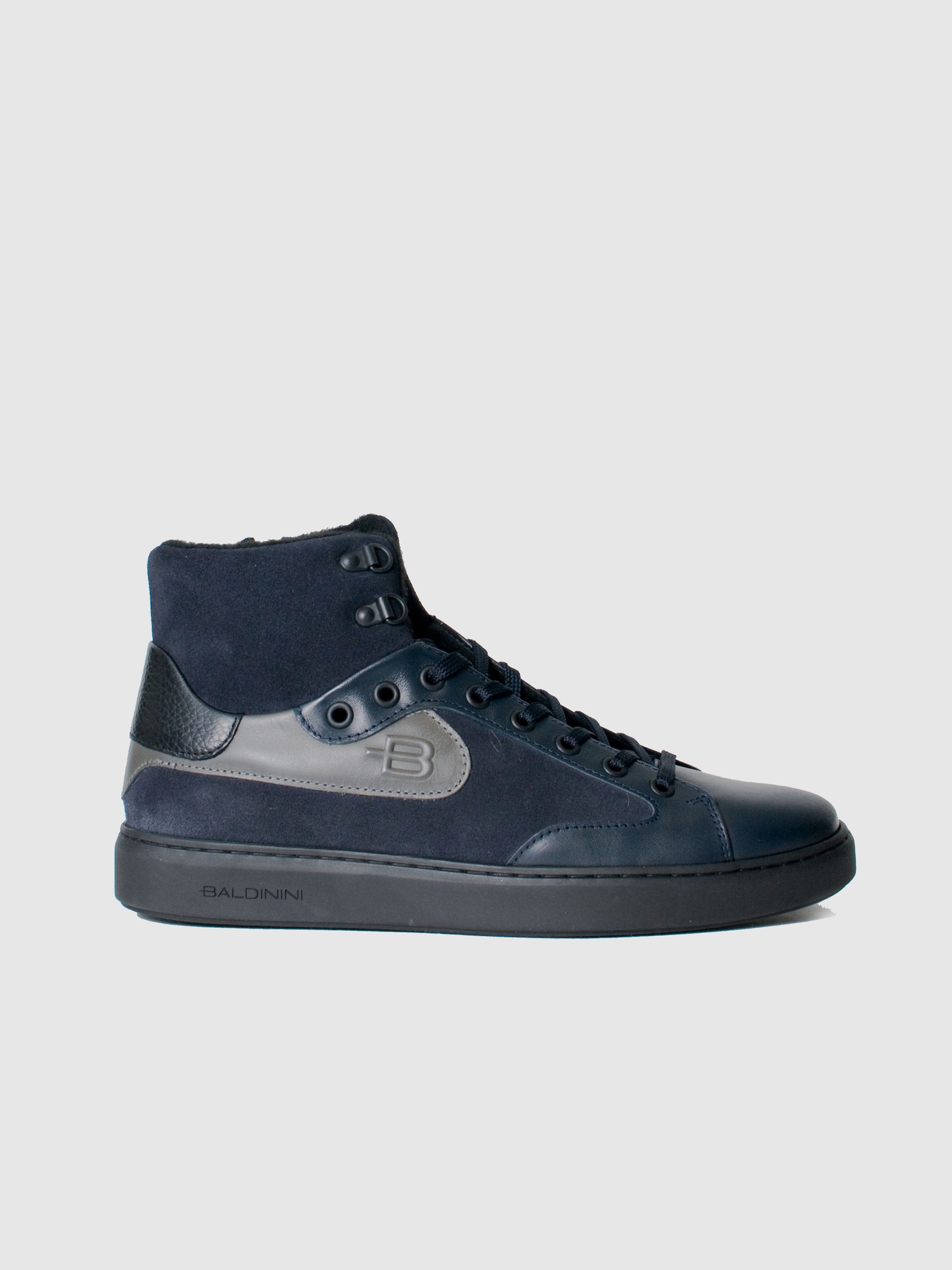 Высокие кроссовки из натуральной синей кожи с добавлением замши. Если вы весь день на ногах, то по достоинству оцените их прочную структуру и мягкость при носке. Кожаная стелька и подклад из шерсти обеспечат комфорт во время прогулок, а текстильная шнуровка — удобное прилегание. Высокая подошва — из резины.