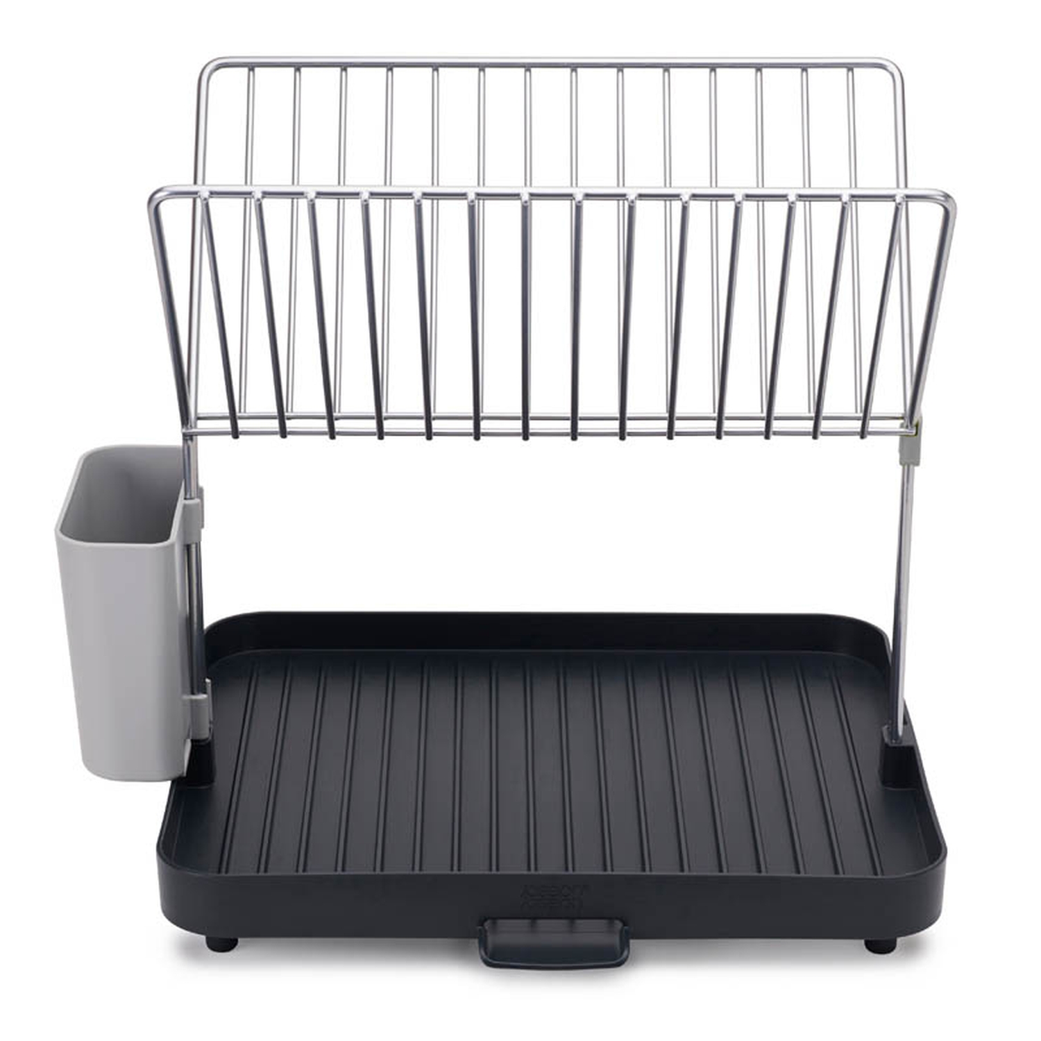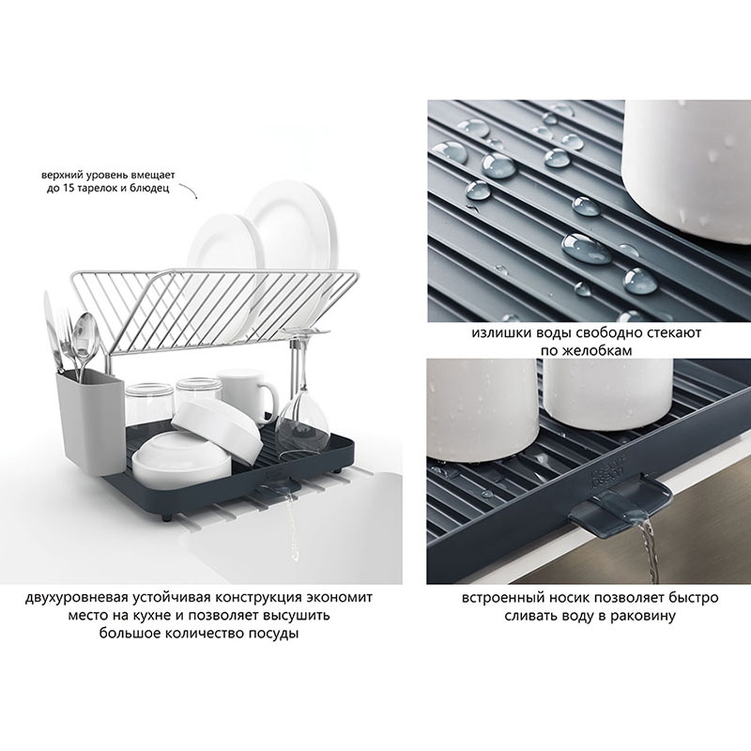 Эргономичная сушилка для посуды, позволяющая сэкономить место на кухне. Двухуровневая конструкция состоит из устойчивого основания для кастрюль, сковородок и чашек и из верхней решетки, вмещающей до 15 тарелок и блюдец. Объемное отделение со сливом предоставляет возможность тщательно осушить до 4 комплектов посуды и все это на минимальном участке пространства. Вода свободно стекает по желобкам, расположенным у основания под наклоном, а встроенный носик позволяет быстро сливать жидкость прямо в раковину. Нескользящие ножки обеспечивают устойчивость. Конструкция разбирается на части для легкой очистки. Инструкции по сборке идут в комплекте.