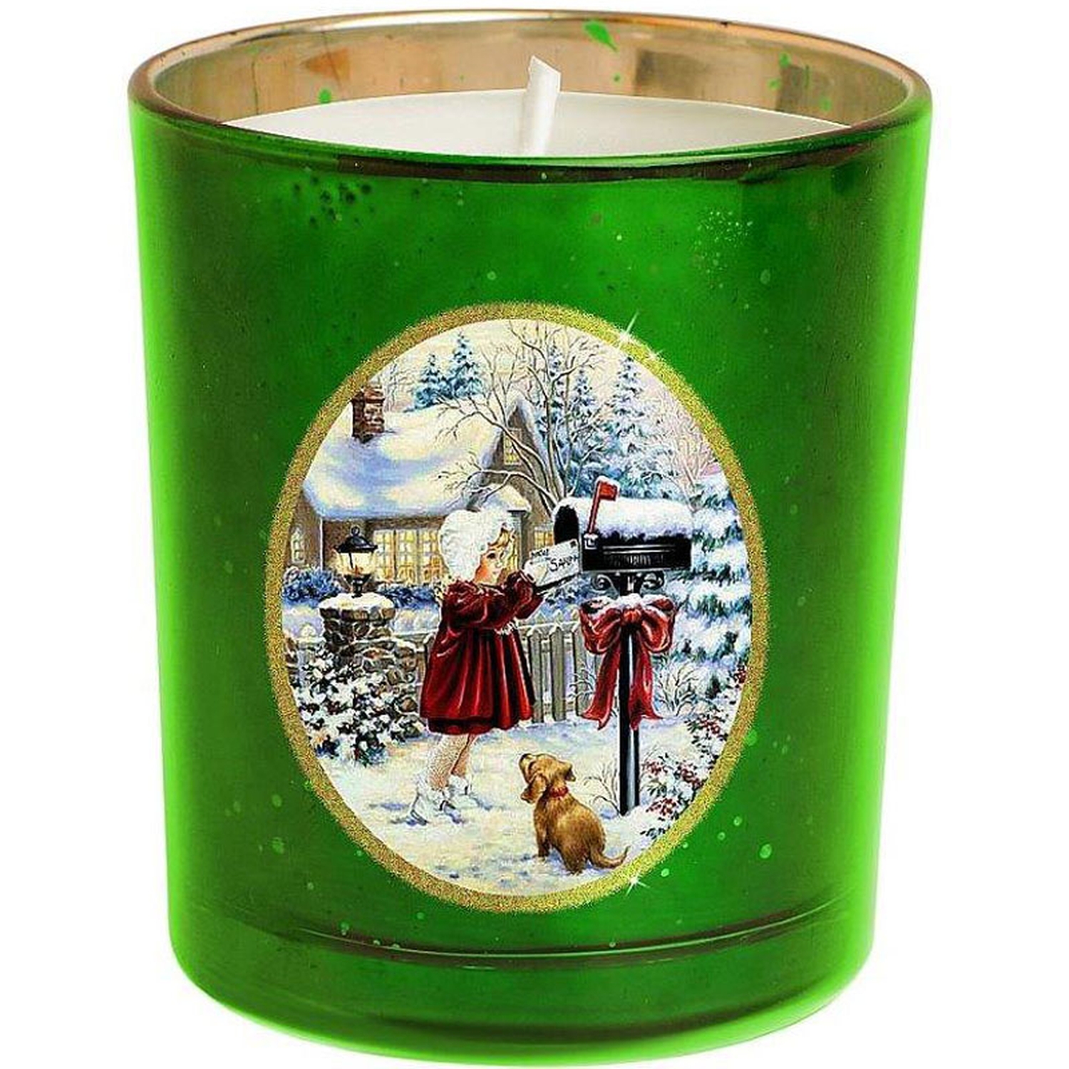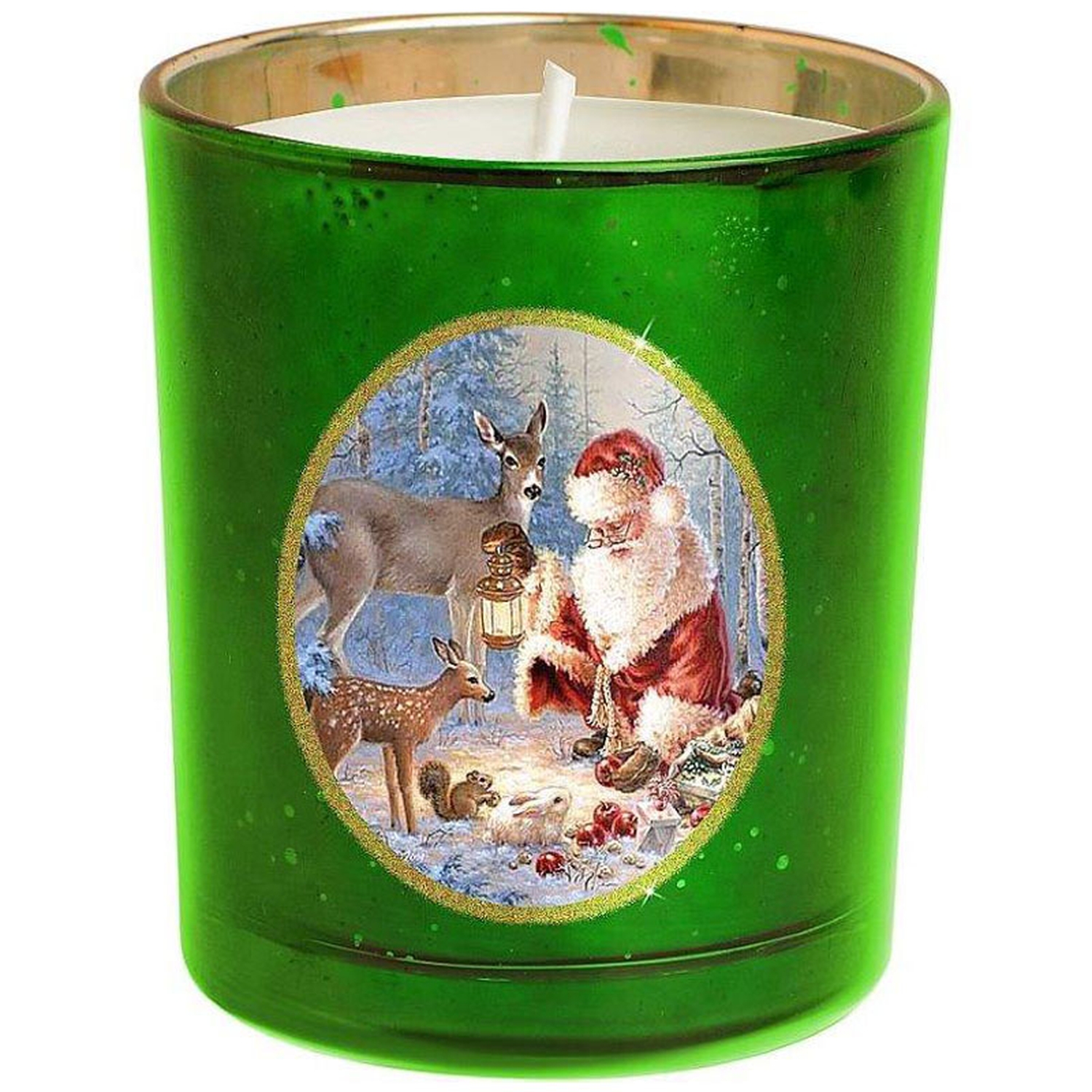 На первый взгляд может показаться, что свеча уже довольно банальный подарок на Новый Год. Но свечи тоже бывают разные. Интернет магазин Mister Christmas предлагает широкий ассортимент самых оригинальных и стильных декоративных свечей. Особого внимания заслуживает декоративная свеча «Зимняя сказка». Сделанная из качественного воска, она помещена в стакан-подсвечник. Он изготовлен из прочного толстого зеленого стекла, изнутри покрытого золотистой краской. На подсвечник нанесен рисунок новогодний сюжет: Дед Мороз в компании со своими оленями готовится к празднику в заснеженном лесу. Рисунок выполнен качественными стойкими красками. Каждая линия, каждая черточка все это сделано вручную. Высота декоративной свечи 8 см. Она атмосферно украсит праздничный стол дома или рабочее место в офисе. Вам не придется думать над тем, как упаковать такой подарок. Зеленая декоративная свеча «Зимняя сказка» Mister Christmas продается в стильной прозрачной пластиковой упаковке, перевязанной серебрян