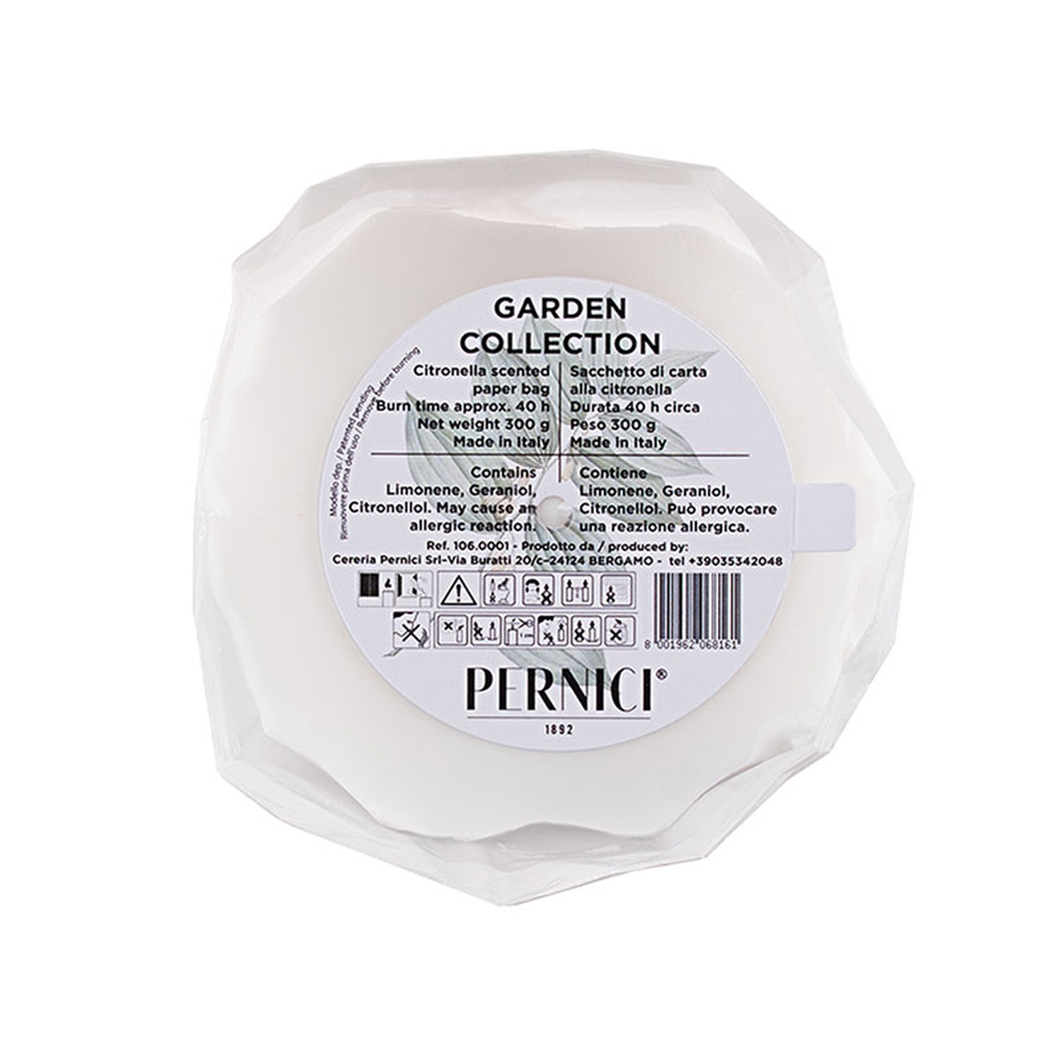 Уличные свечи Pernici Garden — свечи для загородной жизни, для летних террас, для отдыха на природе, для больших открытых пространств, пикников Чувствуете настроение отдыха? Настроение теплой романтической атмосферы, атмосферы дружбы, любви! Свечи Pernici Garden, в состав которых входит натуральное масло цитронеллы эффективный репеллент, не представляющий угрозу для окружающей среды и отпугивающий насекомых. Уличные свечи в бумажных мешках Pernici Garden — этот инновационный продукт, который появился в конце 2017 года совершенно случайно в результате лабораторных тестирований на фабрике Cereria Pernici в Бергамо. В начале 2018 года, как только было установлено, что изделие имеет большой потенциал, оно было запатентовано и пущено в продажу. Время горения: свечи объемом 300 г от 40 часов, свечи объемом 450 г 55 часов. Не рекомендуется жечь свечу более 4 часов затушите свечу, дайте ей остыть, и зажгите свечу вновь. Фитиль по длине не должен превышать 1 см в длину. Это позволить