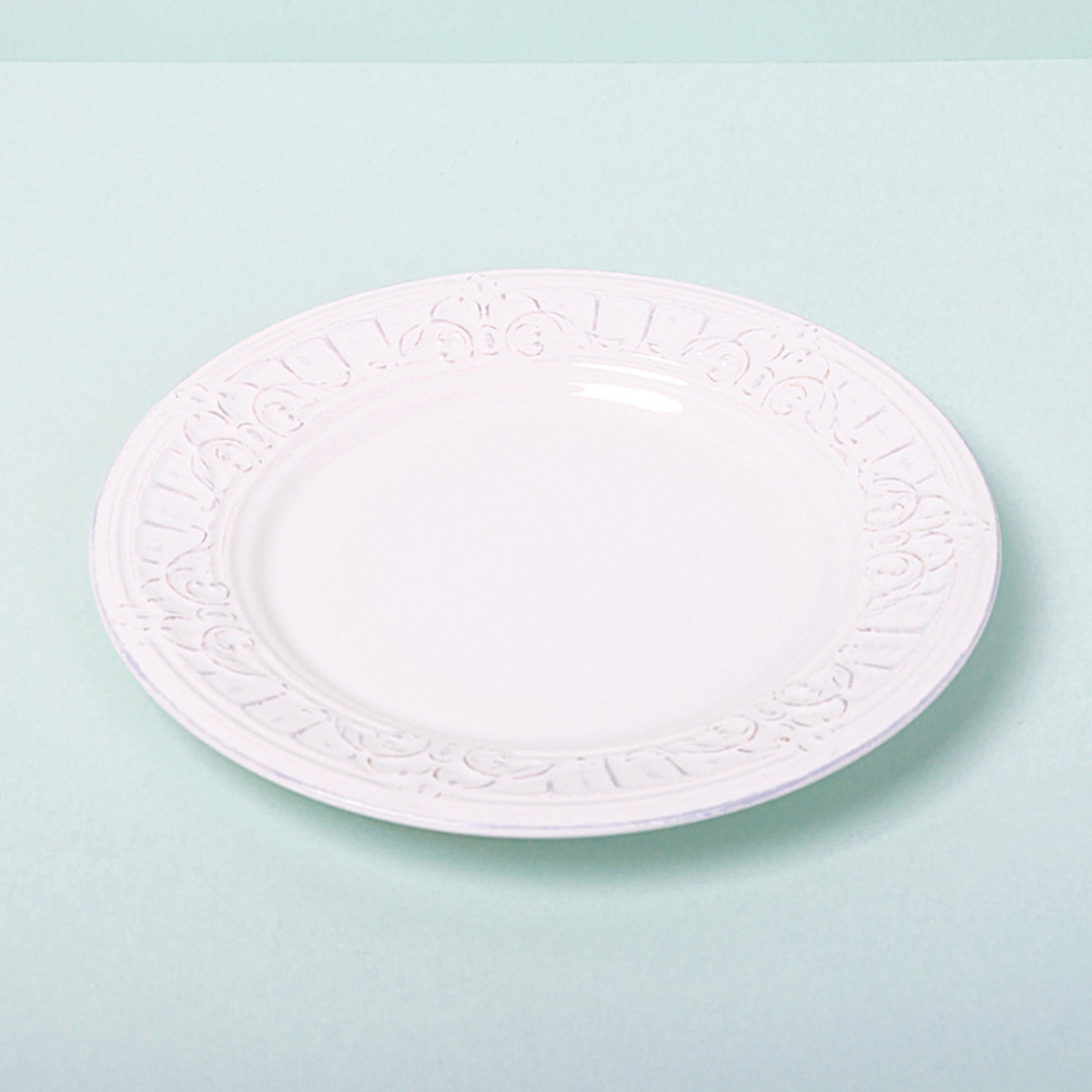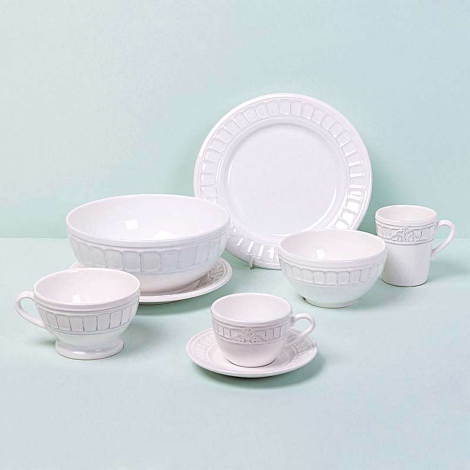 Нежная пастельная гамма (белый и голубой), простые формы, мягкие плавные линии, рельефный рисунок с эффектом «потертости». Разработанный дизайнерами декоративный рисунок переносит нас в эпоху Возрождения, но при этом посуда выглядит современно и стильно, что позволяет сервировать практически любой стол. Современные тренды делают возможным сочетание нескольких цветов, например, белая обеденная и голубая десертная тарелки из этой коллекции составят красивую композицию.